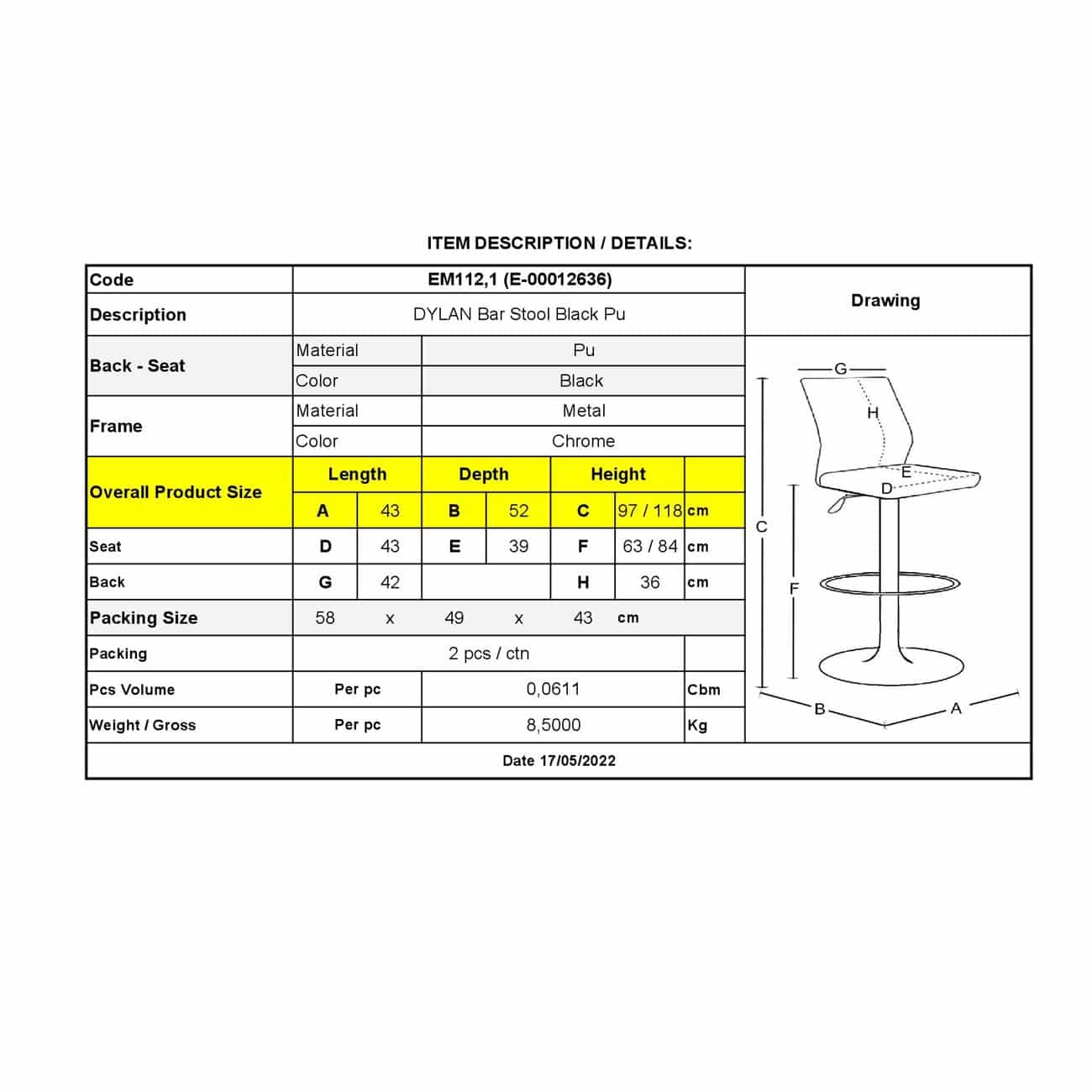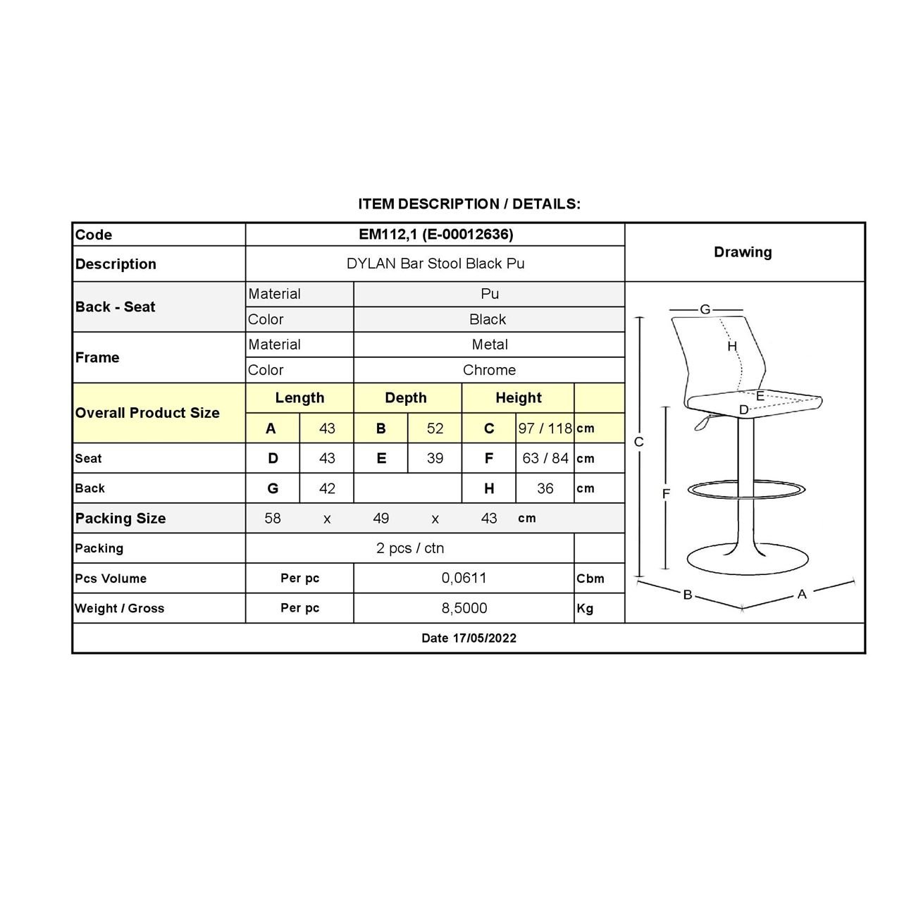 DYLAN Σκαμπό BAR με Πλάτη, Χρώμιο, Pu Μαύρο, Ρυθμιζόμενο Ύψος, Περιστρεφόμενο 40x52x63/97-84/118cm