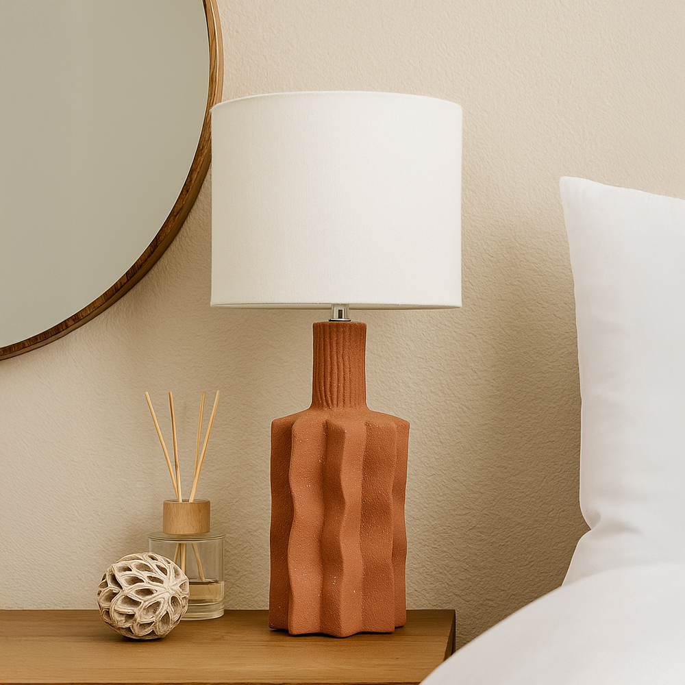 Το επιτραπέζιο φωτιστικό EGLI συνδυάζει κεραμική βάση σε ζεστή terracotta απόχρωση με λευκό λινό καπέλο, προσδίδοντας φυσικότητα και γήινη αρμονία. Με διαστάσεις βάσης 17x17xΥ36cm, είναι ιδανικό για κομοδίνα ή γραφεία. Το design του αποπνέει ζεστασιά και απλότητα, καθιστώντας το ιδανικό για σύγχρονους ή rustic χώρους.