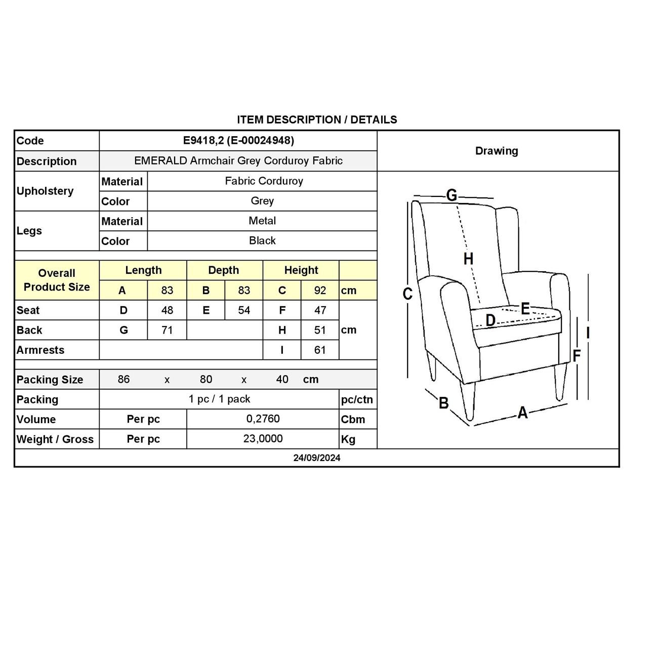 EMERALD Πολυθρόνα Σαλονιού – Καθιστικού, Ύφασμα Κοτλέ Γκρι (Ε-00024948)
