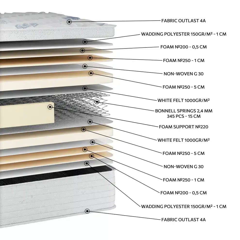 Στρώμα υψηλής σκληρότητας με ελατήρια Bonnell, σχεδιασμένο για ισχυρή στήριξη και αυξημένη αντοχή. Οι παχύτερες στρώσεις αφρού εξασφαλίζουν σταθερότητα και σωστή κατανομή βάρους, αποτρέποντας τη δημιουργία σημείων πίεσης. Το καινοτόμο ύφασμα Outlast 4A ρυθμίζει τη θερμοκρασία, απορροφώντας και απελευθερώνοντας θερμότητα ανάλογα με τις ανάγκες του σώματος, δημιουργώντας ένα προσαρμοσμένο και άνετο περιβάλλον ύπνου. Μια εξαιρετική επιλογή για όσους αναζητούν απόλυτη στήριξη με προηγμένη θερμορύθμιση.