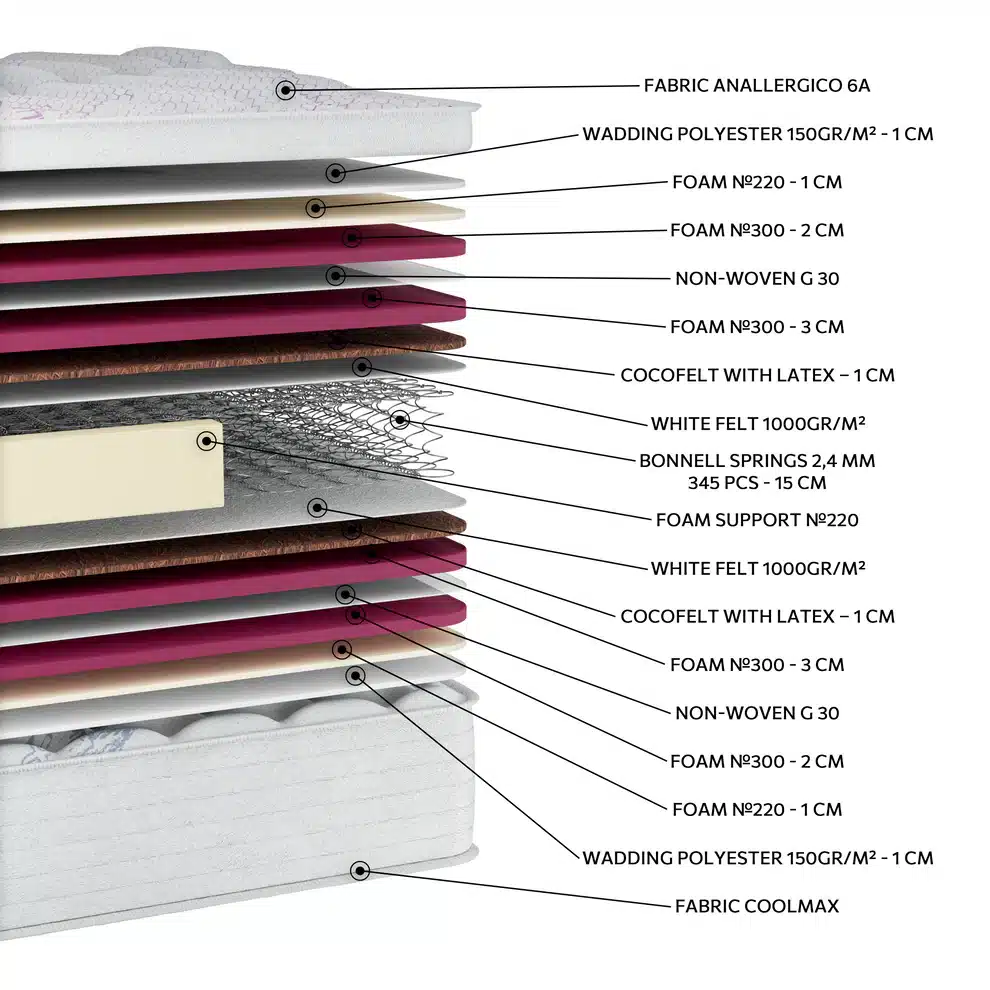 Στρώμα υψηλής σκληρότητας με Bonnell Springs, σχεδιασμένο για ανθεκτικότητα και ισχυρή στήριξη. Οι στρώσεις αφρού και κοκοφοίνικα με λάτεξ προσφέρουν εξαιρετική σταθερότητα, διατηρώντας τη σπονδυλική στήλη σε ευθυγραμμισμένη θέση. Το αναπνεύσιμο ύφασμα CoolMax συμβάλλει στη σωστή θερμορύθμιση, διατηρώντας το στρώμα δροσερό και υγιεινό. Μια ιδανική επιλογή για όσους χρειάζονται απόλυτη στήριξη και σκληρή αίσθηση ύπνου.