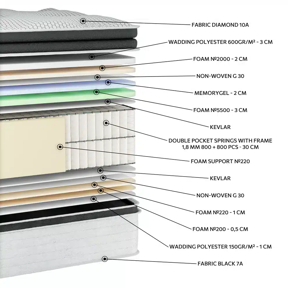 Περιγραφή Στρώμα μέτριο προς μαλακό με διπλό σύστημα ανεξάρτητων ελατηρίων Pocket, που ενισχύει τη στήριξη και διασφαλίζει προσαρμοστικότητα σε κάθε σημείο του σώματος. Το ενσωματωμένο Pillowtop προσφέρει επιπλέον άνεση και πολυτελή αίσθηση αγκαλιάς. Οι στρώσεις MemoryGel και αφρού υψηλής ποιότητας συμβάλλουν στην ανακούφιση από την πίεση και στη στήριξη της σπονδυλικής στήλης. Το ύφασμα Diamond 10A εξασφαλίζει ιδανικό αερισμό και αντοχή. Μια εξαιρετική επιλογή για όσους αναζητούν μαλακή αίσθηση και προηγμένη εργονομία με ενισχυμένη στήριξη. Υλικά
