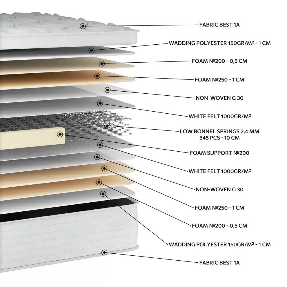 Βρεφικό στρώμα μέτριας σκληρότητας με χαμηλά ελατήρια τύπου Bonnell, σχεδιασμένο για σωστή στήριξη και αντοχή. Οι ενισχυμένες στρώσεις από αφρώδη υλικά εξασφαλίζουν σταθερότητα, ενώ το ύφασμα Best 1A προσφέρει άνεση και δροσερή αίσθηση.