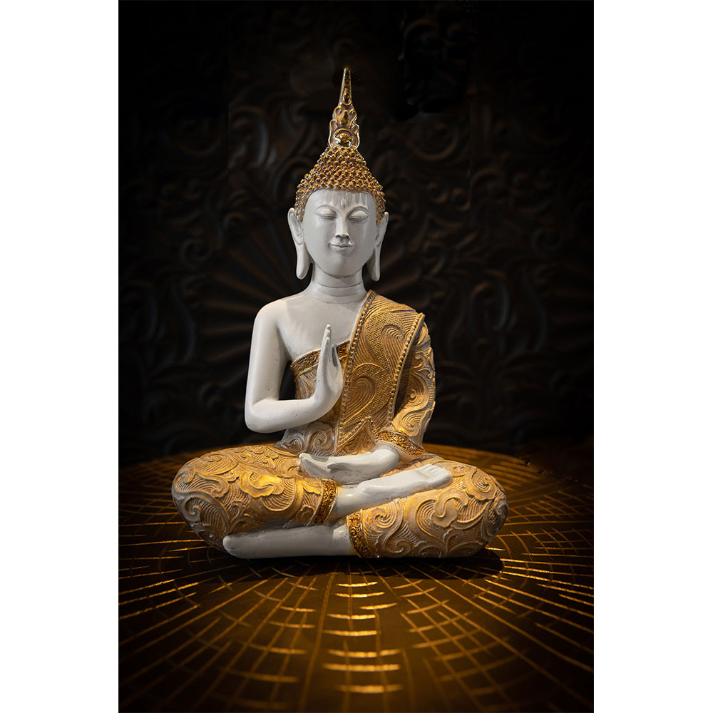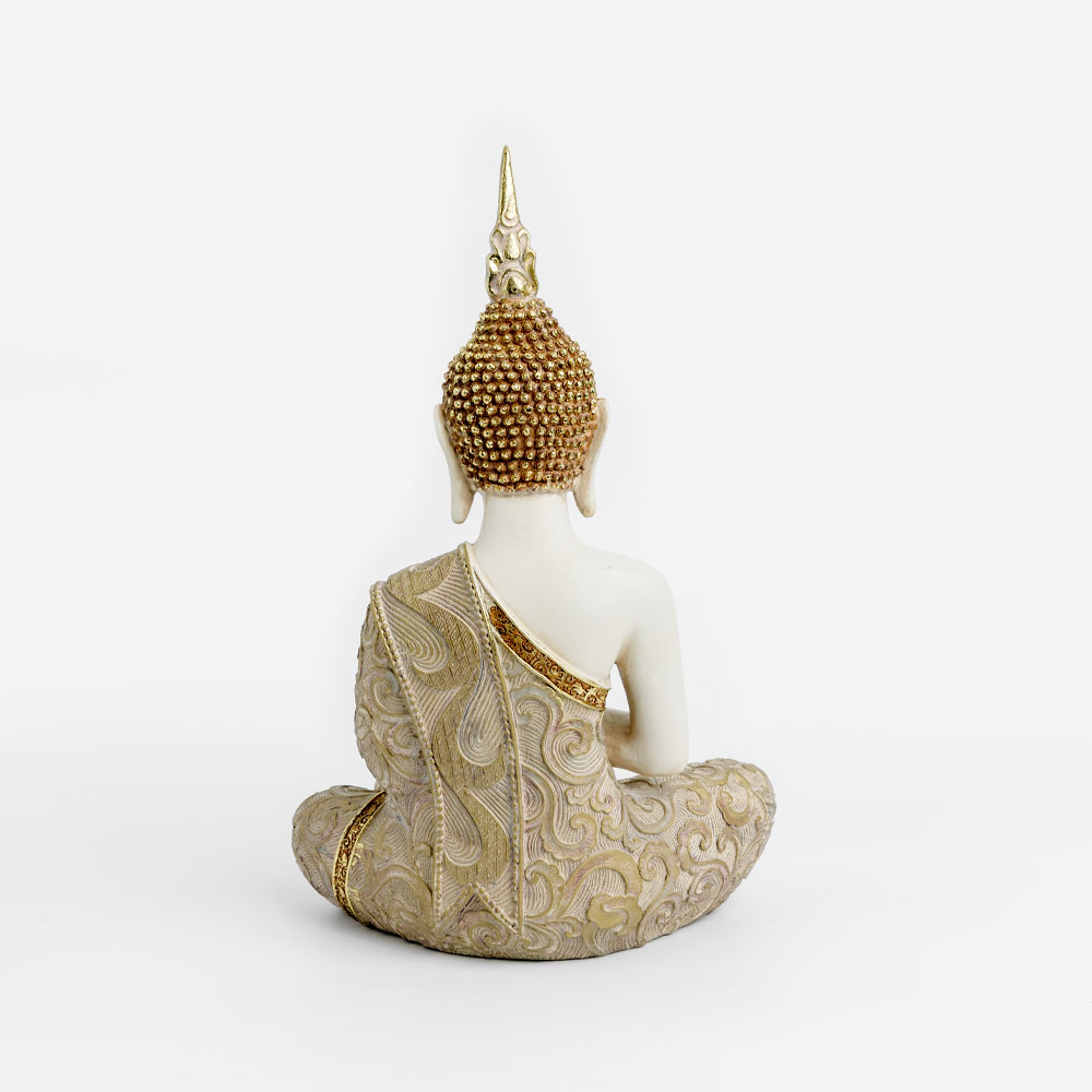 Το άγαλμα FADHI Buddha (22x12x34cm) συνδυάζει την αρμονία του βουδιστικού συμβολισμού με την κομψότητα της διακόσμησης. Με αποχρώσεις μπεζ, χρυσού και απαλού μωβ, και λεπτομέρειες που αποπνέουν πολυτέλεια, αποτελεί ιδανική επιλογή για χώρους γαλήνης, διαλογισμού ή ethnic αισθητικής.