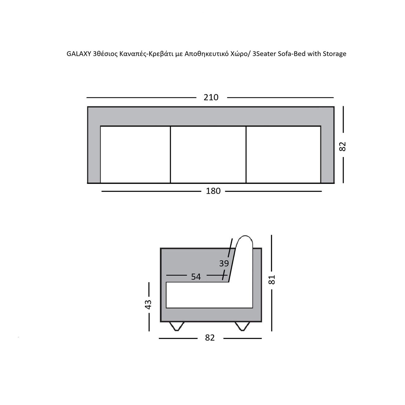 GALAXY Καναπές – Κρεβάτι με Αποθηκευτικό Χώρο, 3Θέσιος Ύφασμα Σκούρο Γκρι Sofa:210x82x81cm Bed:105x180cm