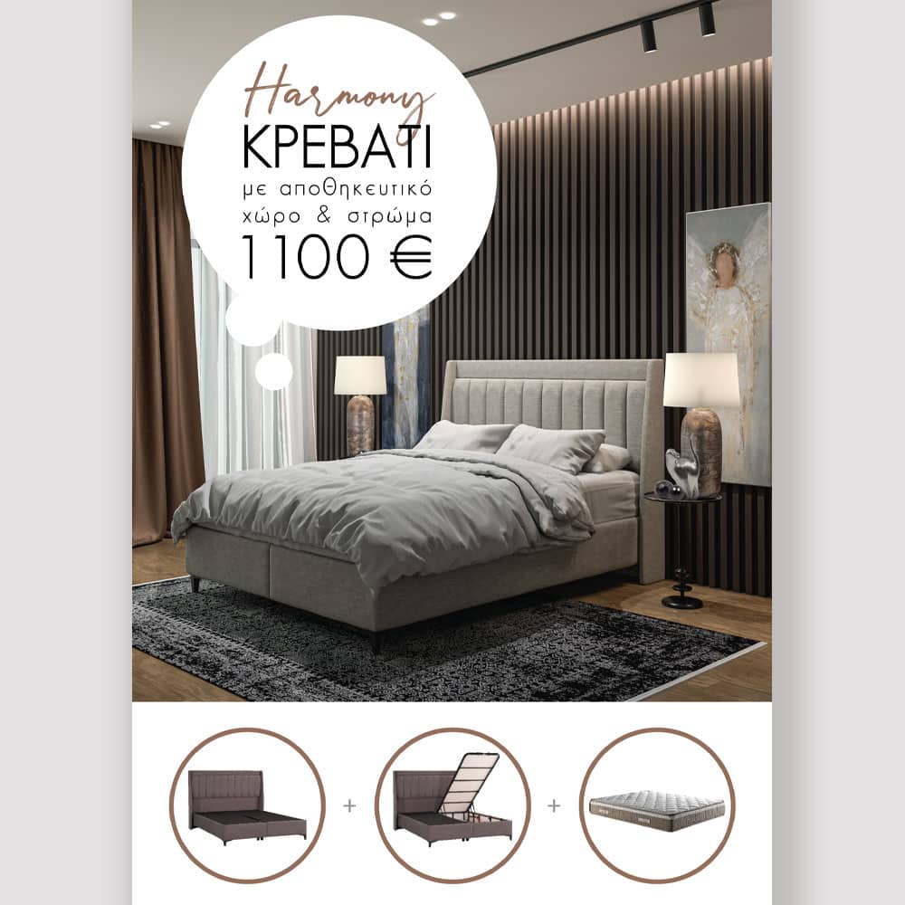 Το κρεβάτι Harmony θα μετατρέψει το δωμάτιο σας σε ένα χώρο γεμάτο ενέργεια όπου θα νιώθετε απόλυτη ασφάλεια και ηρεμία και ταυτόχρονα θα καλύψει την λειτουργική ανάγκη για επιπλέον αποθηκευτικό χώρο.