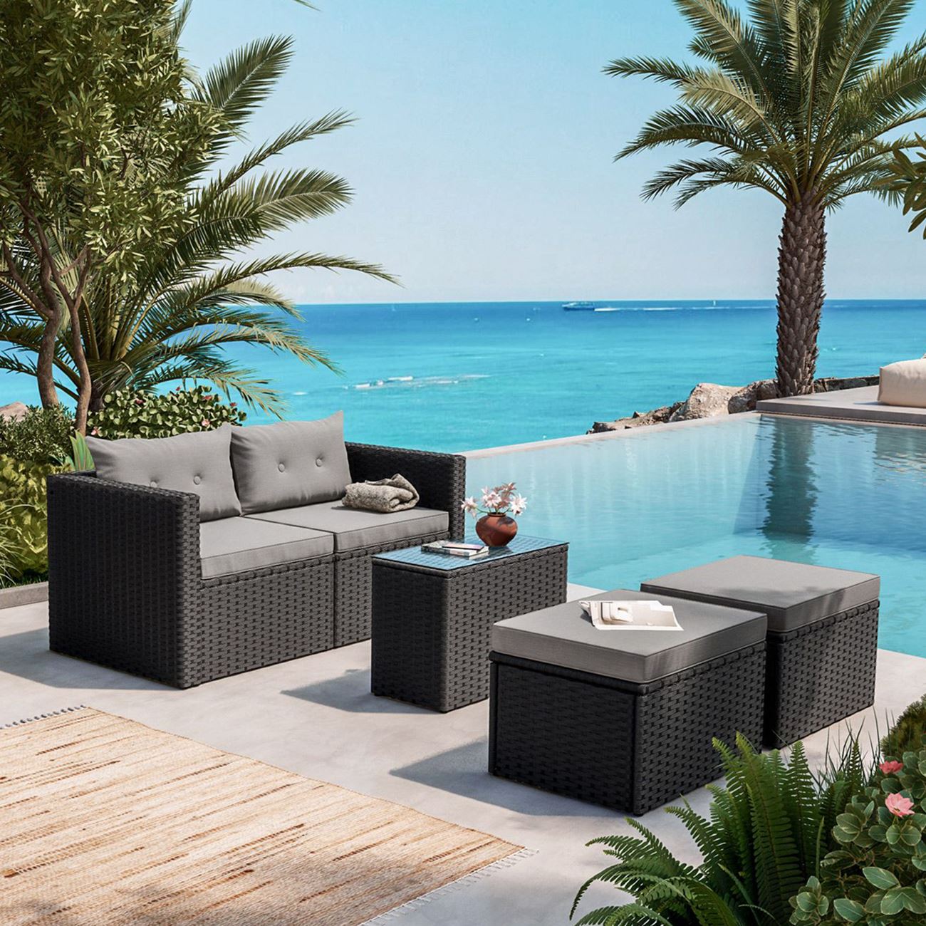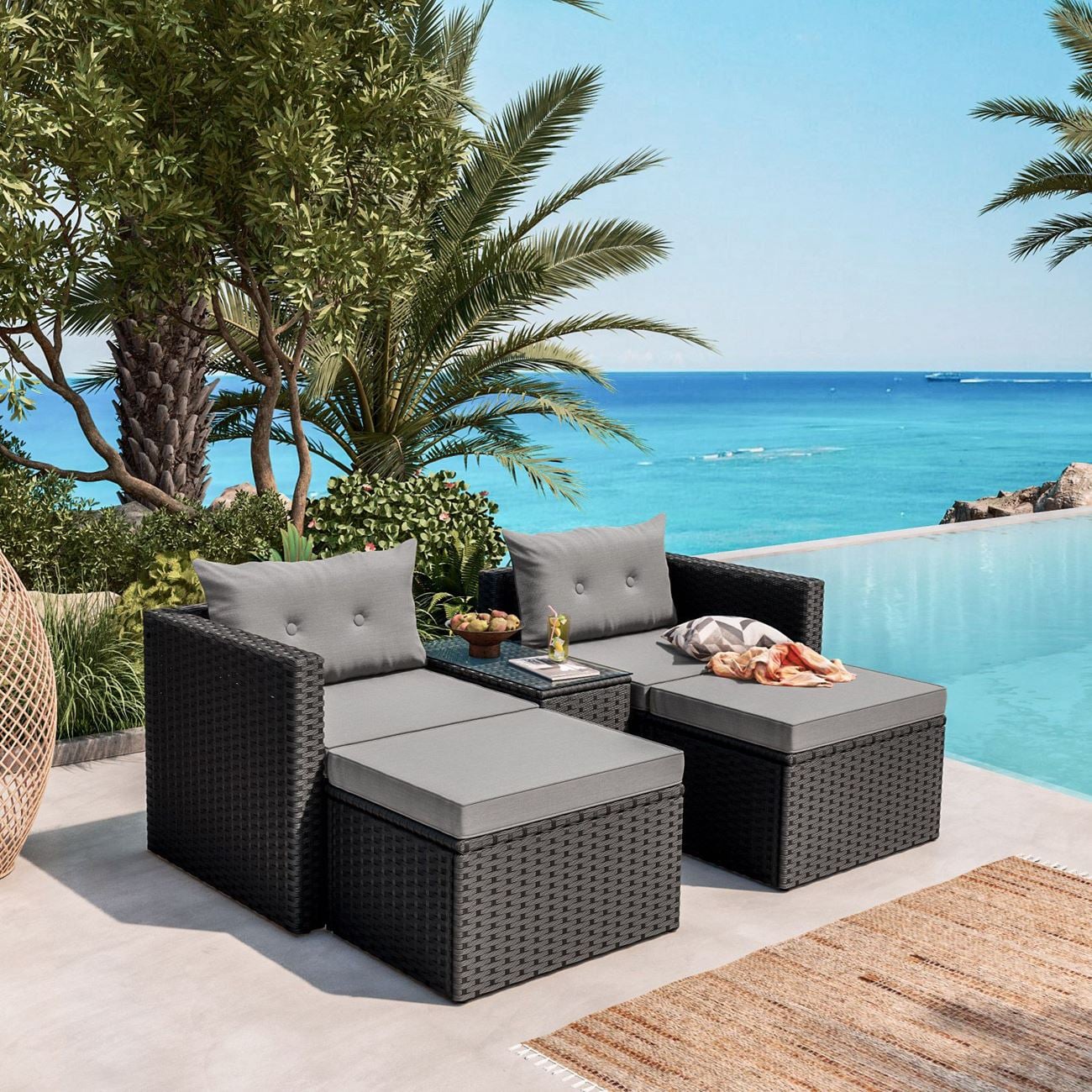 JAKARTA Set Σαλόνι Κήπου K/D, Πολυμορφικό 5τ, Μέταλλο-Wicker Μαύρο, Μαξιλάρια Γκρι 2 Πολυθρ+2 Σκαμπό+1 Τραπεζάκι