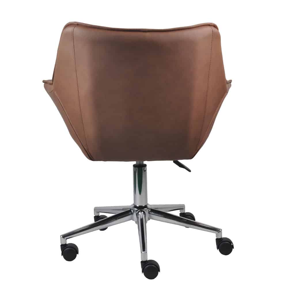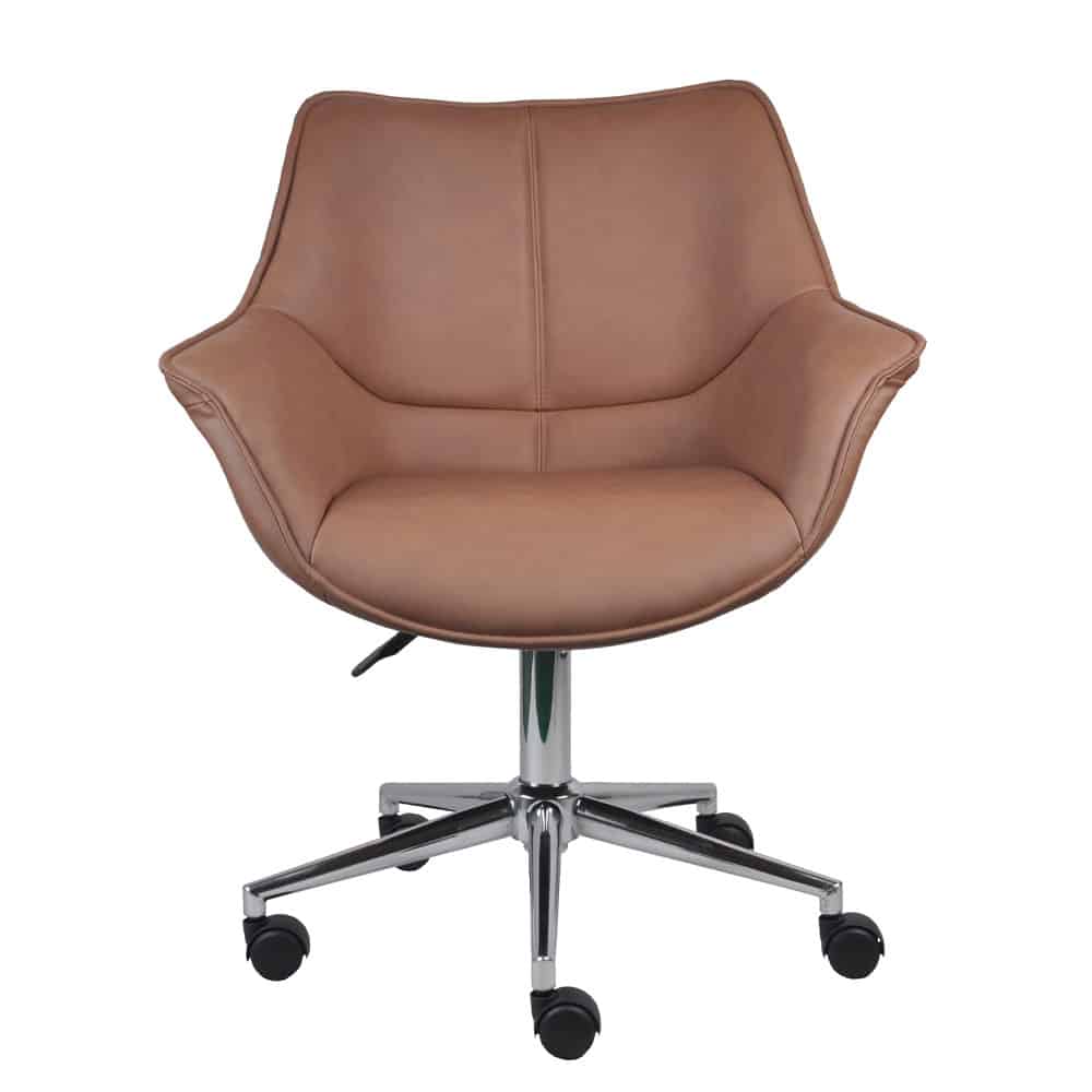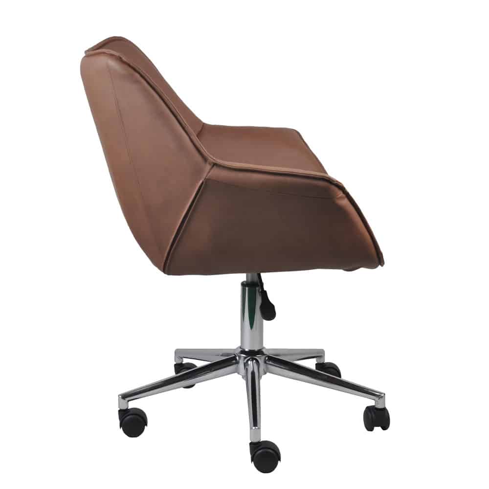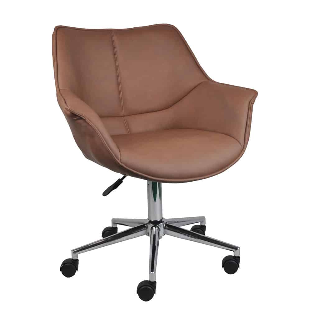 Η καρέκλα γραφείου Jones συνδυάζει διαχρονική κομψότητα και εργονομία, καθιστώντας την ιδανική για κάθε χώρο εργασίας ή οικιακό γραφείο. Το κάθισμα και η πλάτη είναι επενδυμένα με δερματίνη σε ζεστή καφέ απόχρωση, προσφέροντας μια αίσθηση πολυτέλειας και άνεσης. Η στιβαρή μεταλλική βάση από χρώμιο εξασφαλίζει ανθεκτικότητα και σταθερότητα, ενώ ο κομψός σχεδιασμός προσθέτει μια εκλεπτυσμένη πινελιά στον χώρο σας.Η Jones είναι η τέλεια επιλογή για όσους αναζητούν μια καρέκλα που συνδυάζει λειτουργικότητα, αντοχή και στυλ.