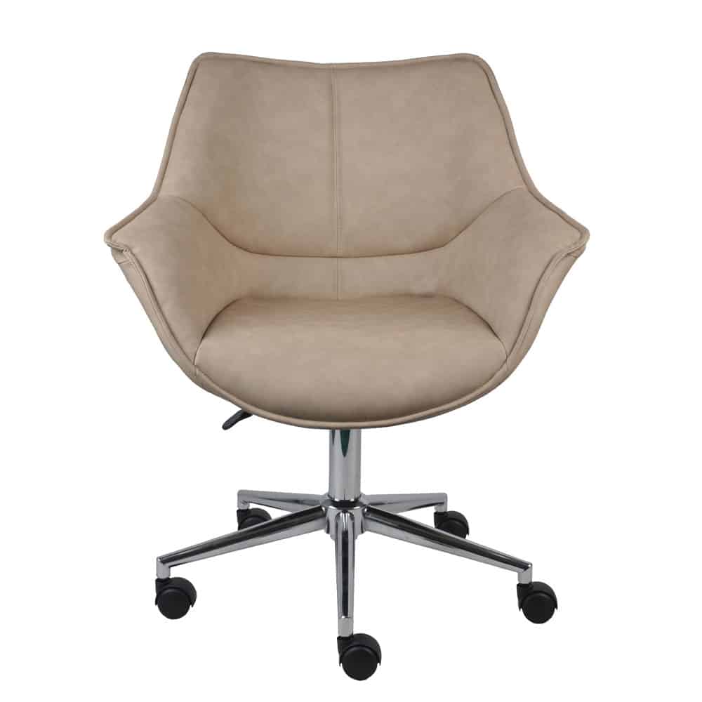 Η καρέκλα γραφείου Jones συνδυάζει διαχρονική κομψότητα και εργονομία, καθιστώντας την ιδανική για κάθε χώρο εργασίας ή οικιακό γραφείο. Το κάθισμα και η πλάτη είναι επενδυμένα με δερματίνη σε ζεστή μπεζ απόχρωση, προσφέροντας μια αίσθηση πολυτέλειας και άνεσης. Η στιβαρή μεταλλική βάση από χρώμιο εξασφαλίζει ανθεκτικότητα και σταθερότητα, ενώ ο κομψός σχεδιασμός προσθέτει μια εκλεπτυσμένη πινελιά στον χώρο σας.Η Jones είναι η τέλεια επιλογή για όσους αναζητούν μια καρέκλα που συνδυάζει λειτουργικότητα, αντοχή και στυλ.