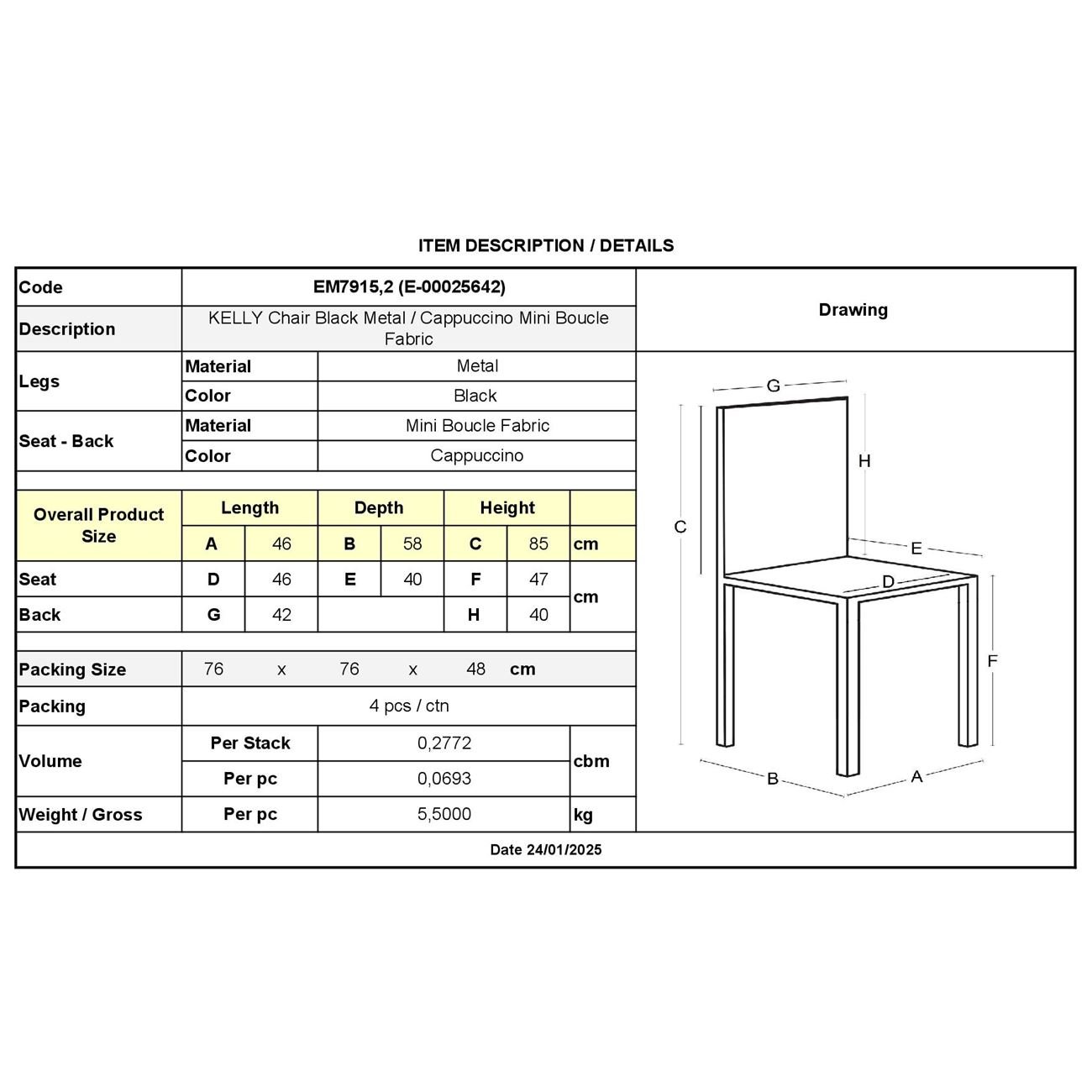 ΕΜ7915,2 KELLY Καρέκλα Μέταλλο Μαύρο/Ύφ.Mini Boucle Cappuccino