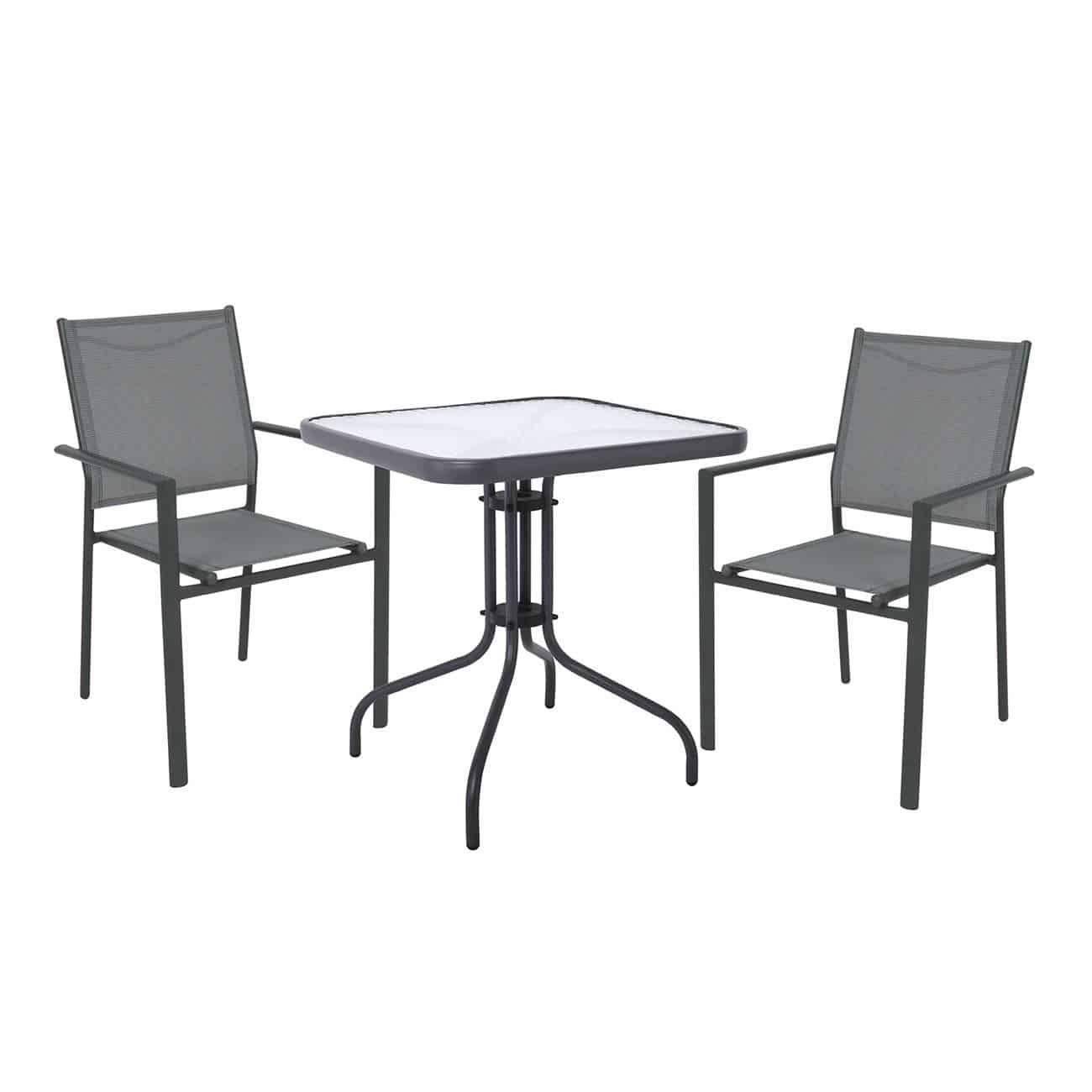 LANSON – BALENO Set Τραπεζαρία Μέταλλο Ανθρακί, Textilene Γκρι: Τραπέζι + 2 Πολυθρόνες Table:70x70x70 Chair:55x55x86