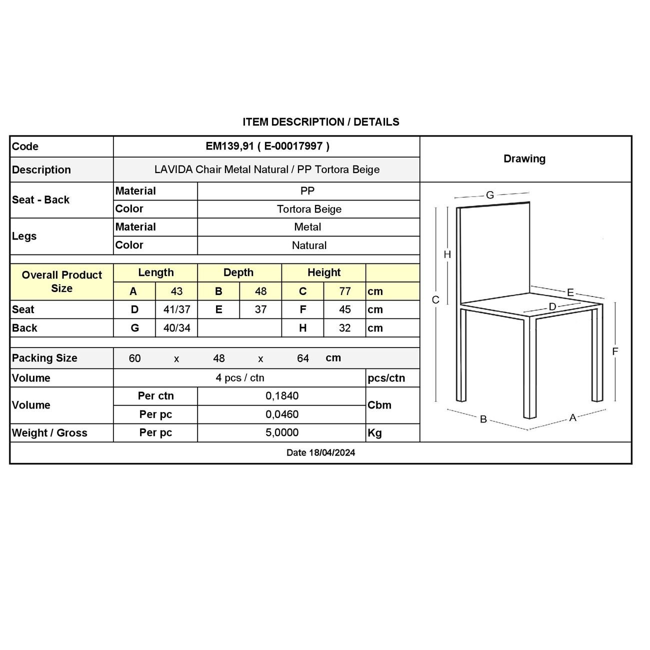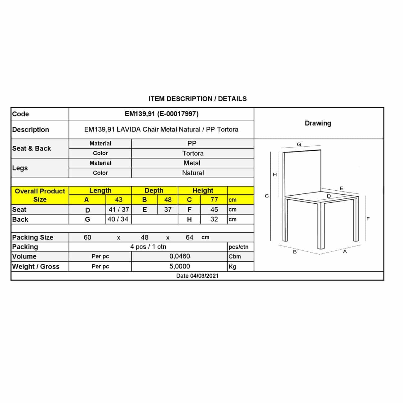 ΕΜ139,91 LAVIDA Καρέκλα Μεταλλική Φυσικό, PP Tortora