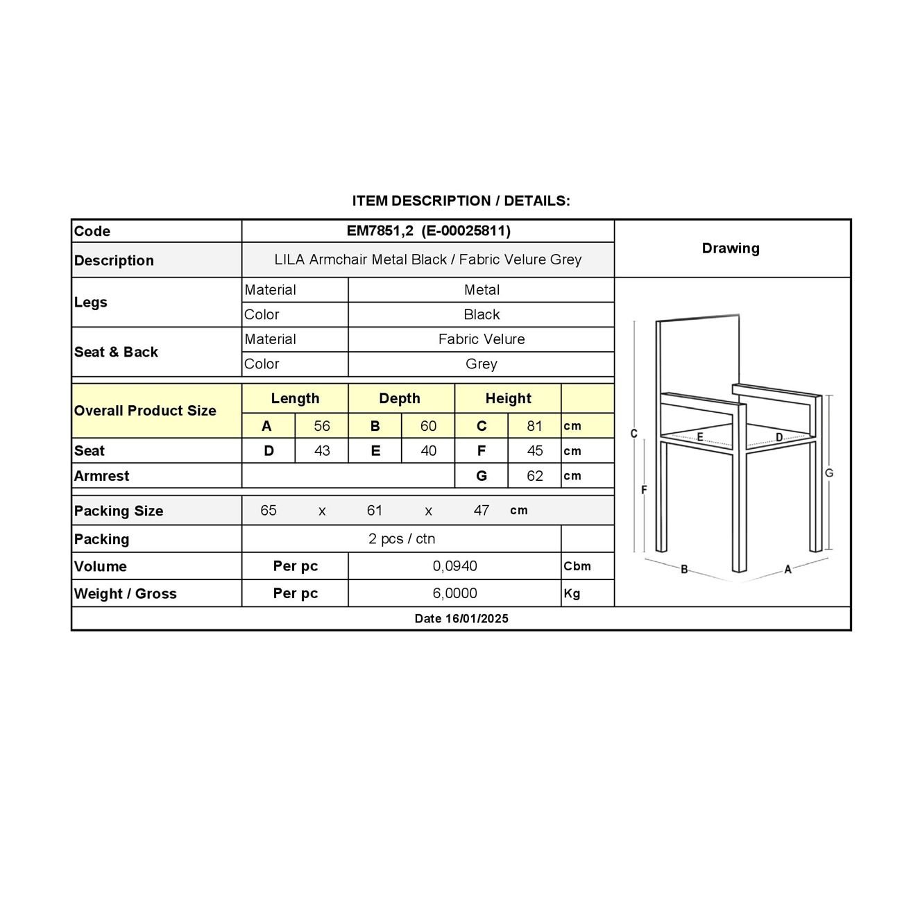 LILA Πολυθρόνα Μέταλλο Βαφή Μαύρο, Ύφασμα Velure Απόχρωση Γκρι (Ε-00025811)