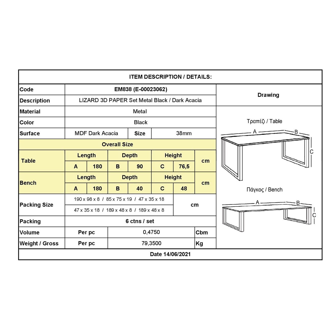 LIZARD 3D PAPER Set: Τραπέζι 180x90cm + 2 Πάγκοι Μέταλλο Βαφή Μαύρο, Dark Acacia Table180x90x77 Bench:180x40x47