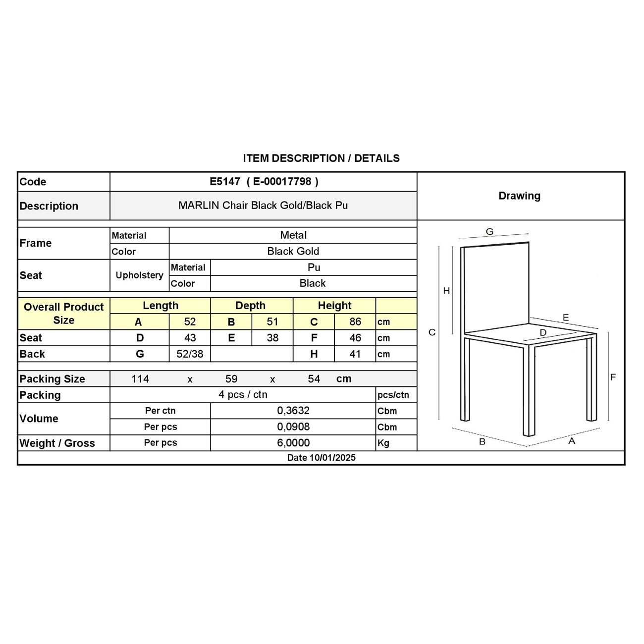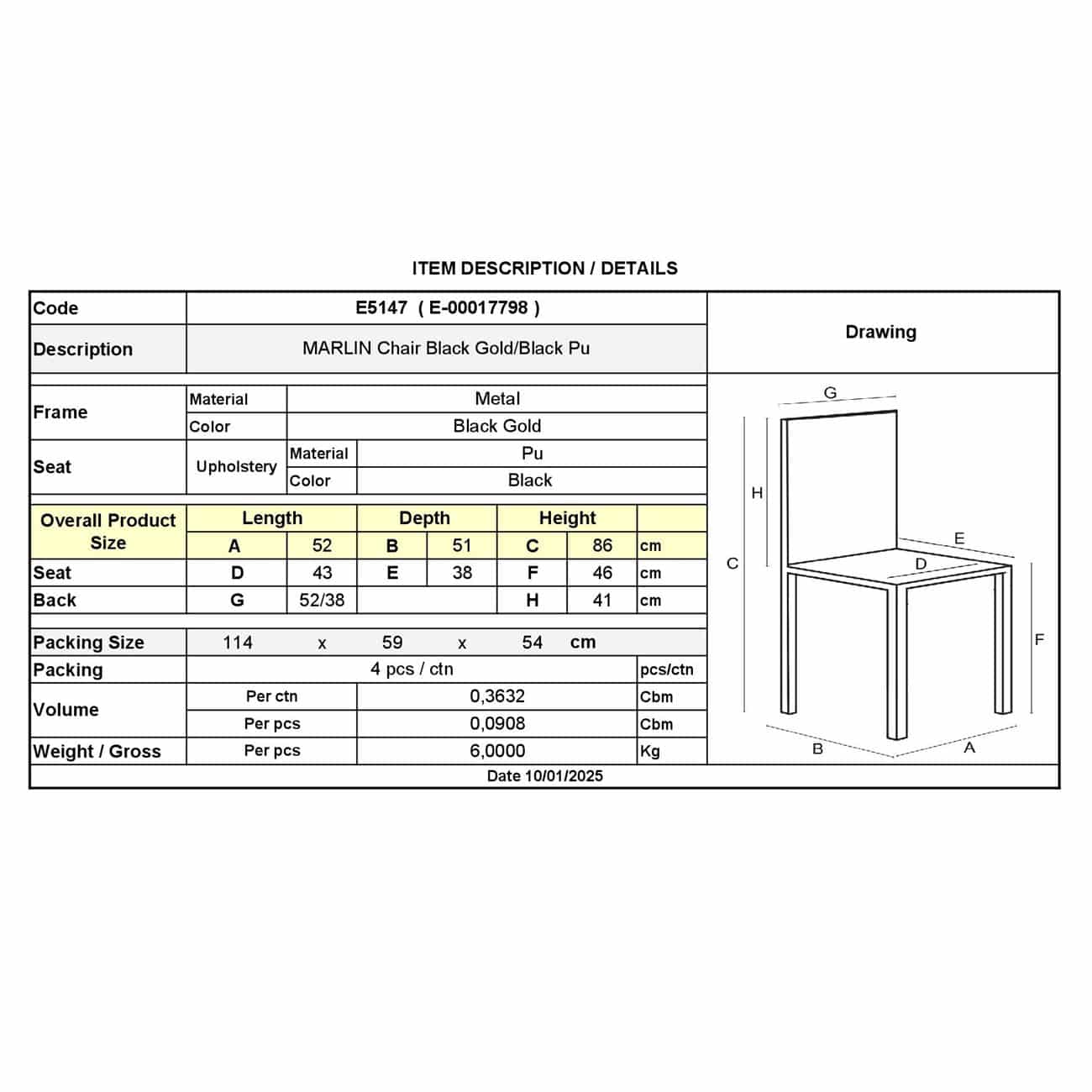 MARLIN Καρέκλα Τραπεζαρίας Μέταλλο Βαφή Black Gold, PU Μαύρο 52x51x86cm