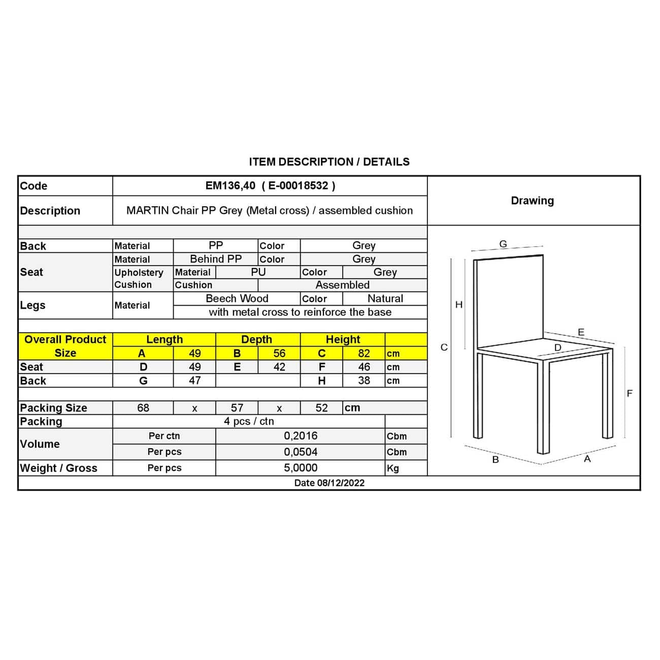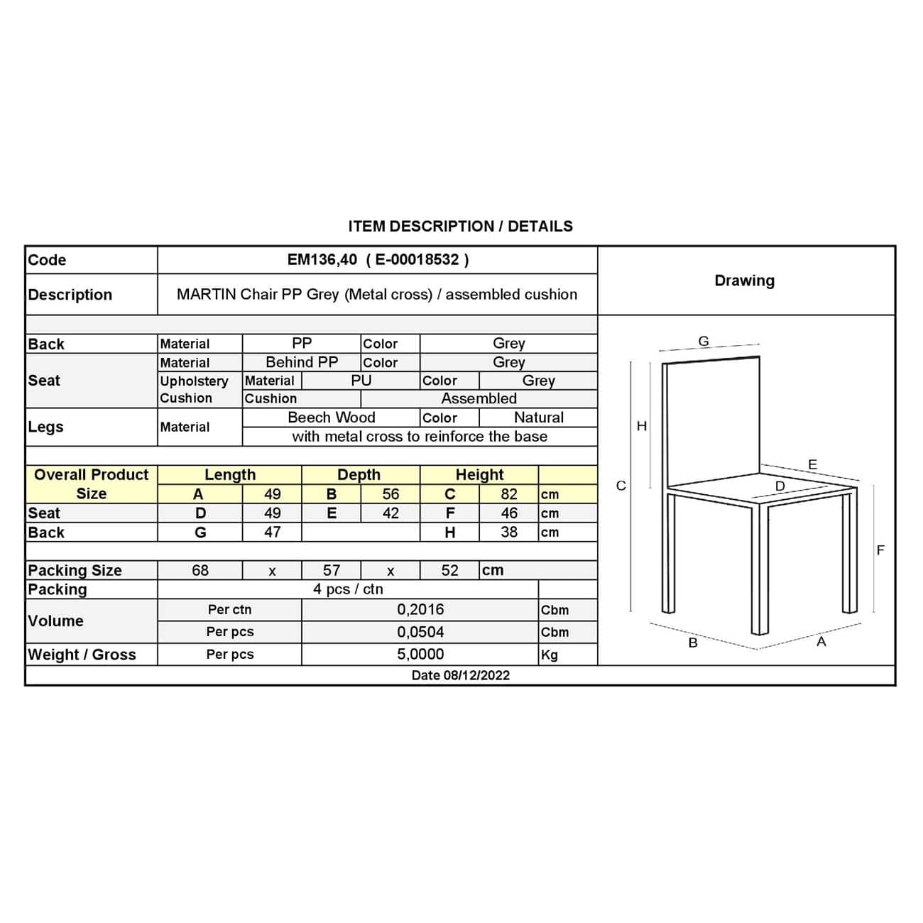 ΕΜ136,40 MARTIN Metal Cross Καρέκλα PP Γκρι (Ξύλ.πόδι-Μοντ/νη Tαπετσαρία)/Pro