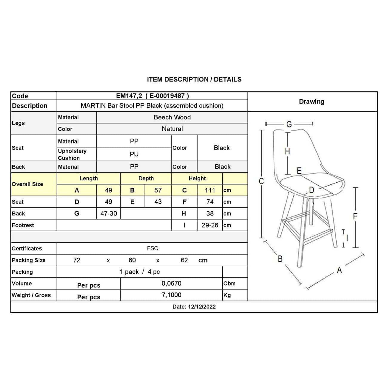 ΕΜ147,2 MARTIN Σκαμπό Bar PP Μαύρο (Μοντ/νη ταπετσαρία)