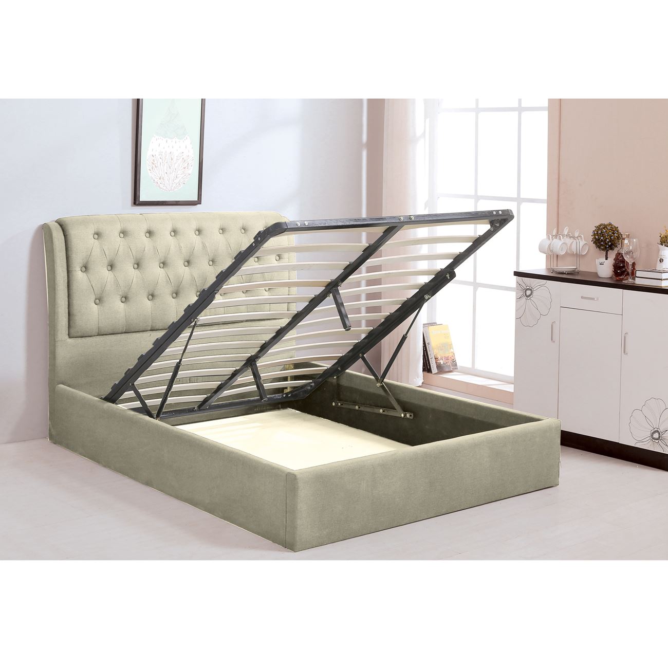 MAXWELL Κρεβάτι Διπλό με Αποθηκευτικό Χώρο, για Στρώμα 160x200cm, Ύφασμα Εκρού 166x221x104cm