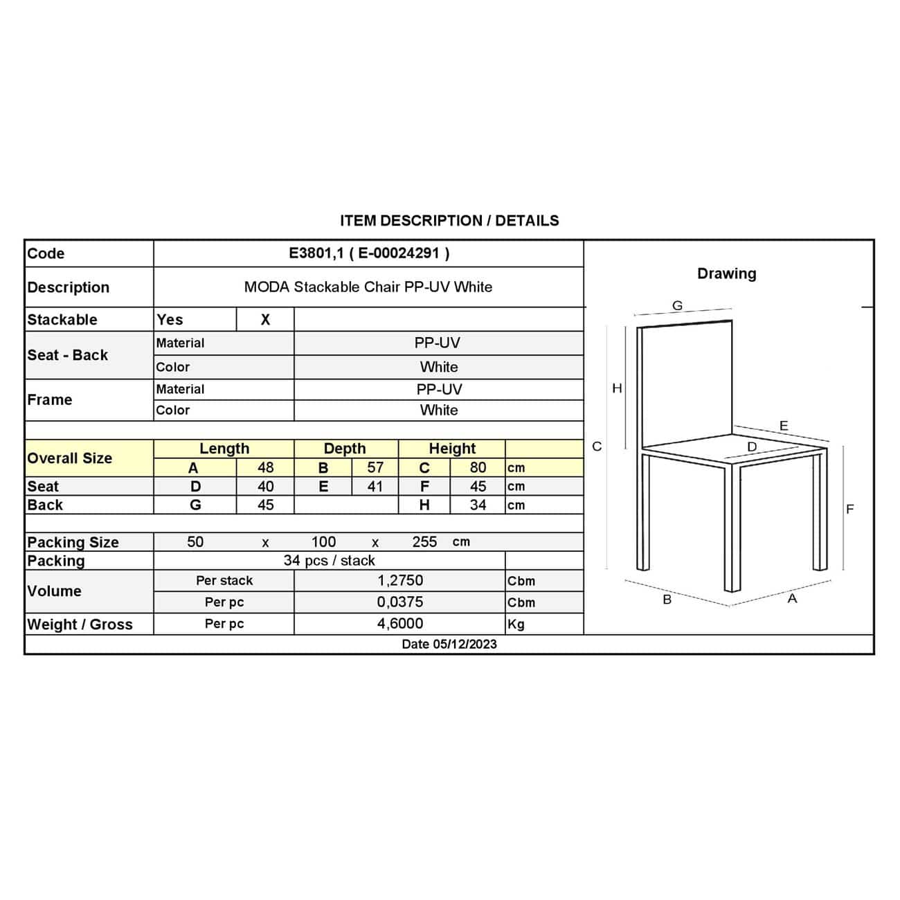 MODA Καρέκλα-Pro Στοιβαζόμενη PP – UV Protection, Απόχρωση Άσπρο 48x57x80cm