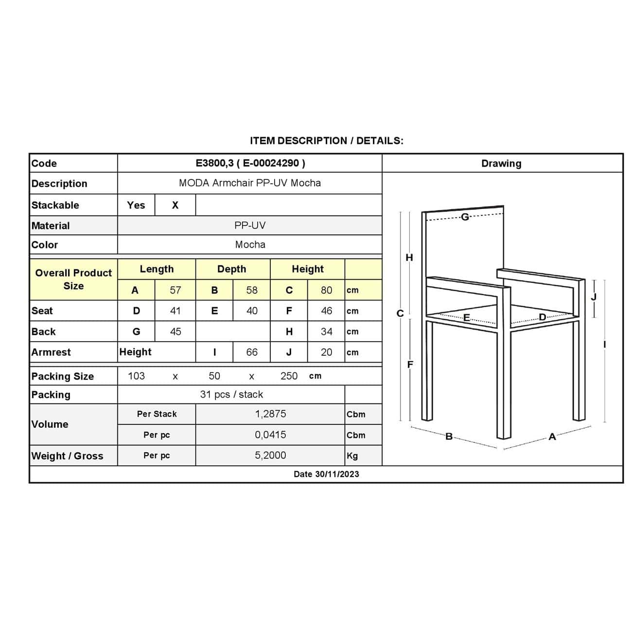 MODA Πολυθρόνα-Pro Στοιβαζόμενη, PP-UV Protection Απόχρωση Mocha (Ε-00024290)