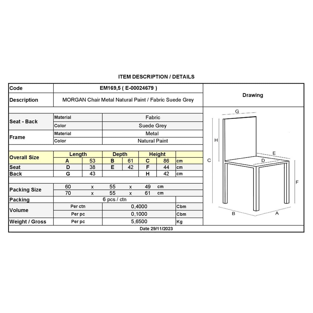 ΕΜ169,5 MORGAN Καρέκλα Μέταλλο Βαφή Φυσικό/Ύφ.Suede Γκρι