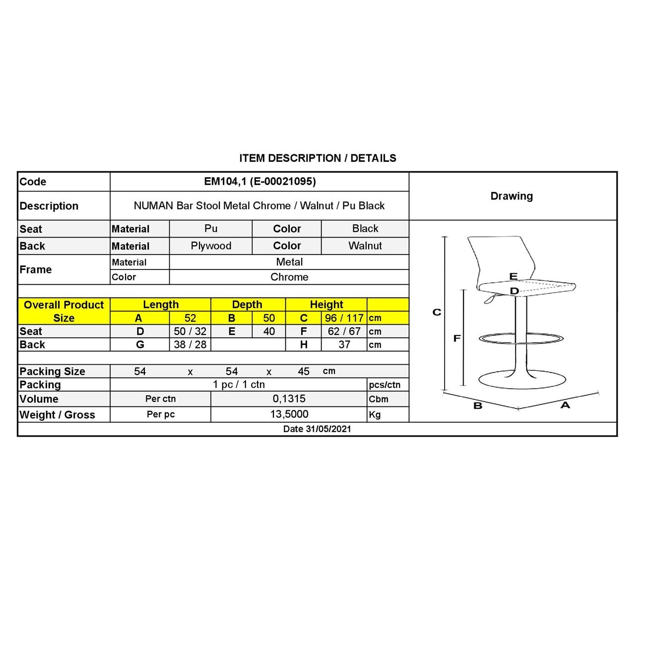 ΕΜ104,1 ΕΜ104,1 NUMAN Σκαμπό Bar Χρώμιο-Καρυδί/Pu Μαύρο