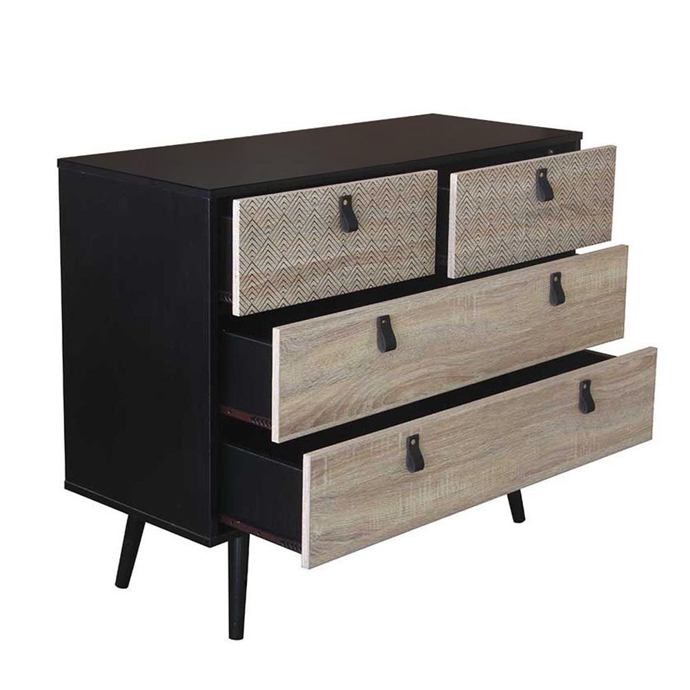 Η συρταριέρα Omnia συνδυάζει την κομψότητα με τη μοντέρνα αισθητική, δημιουργώντας ένα μοναδικό έπιπλο που εντυπωσιάζει. Κατασκευασμένη από επένδυση μελαμίνης σε μαύρη απόχρωση, προσφέρει ένα διαχρονικό και στιβαρό πλαίσιο. Τα τέσσερα ευρύχωρα συρτάρια σε ανοιχτόχρωμη απόχρωση ξύλου δρυός (Sonoma) με γεωμετρικά σχέδια στις όψεις τους, προσδίδουν μοναδική λεπτομέρεια και στυλ. Η Omnia δεν είναι μόνο πρακτική, αλλά και ιδανική για να αναβαθμίσει τη διακόσμηση κάθε σύγχρονου εσωτερικού χώρου.