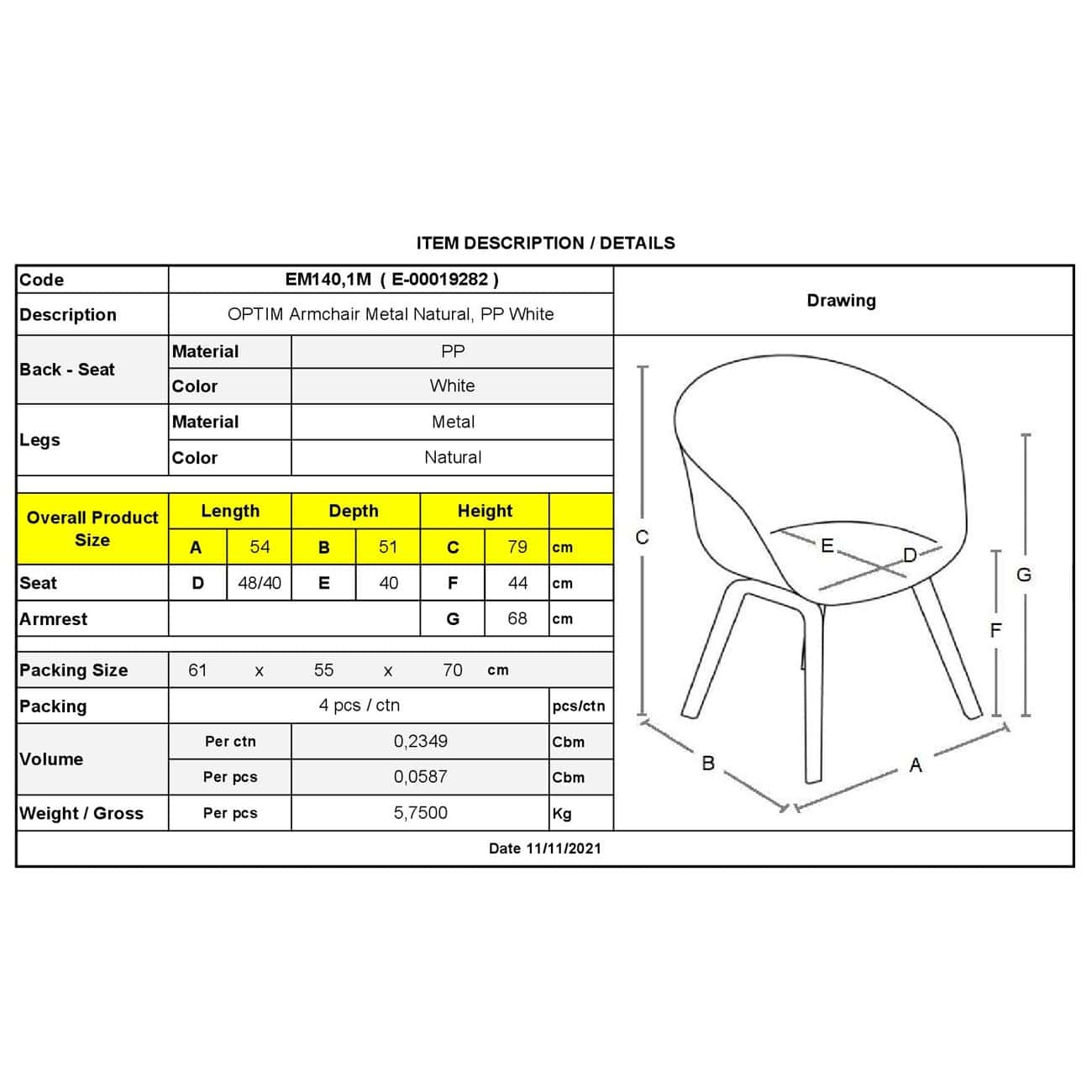 ΕΜ140,1Μ OPTIM Πολυθρόνα Μεταλ.Φυσικό, PP Άσπρο