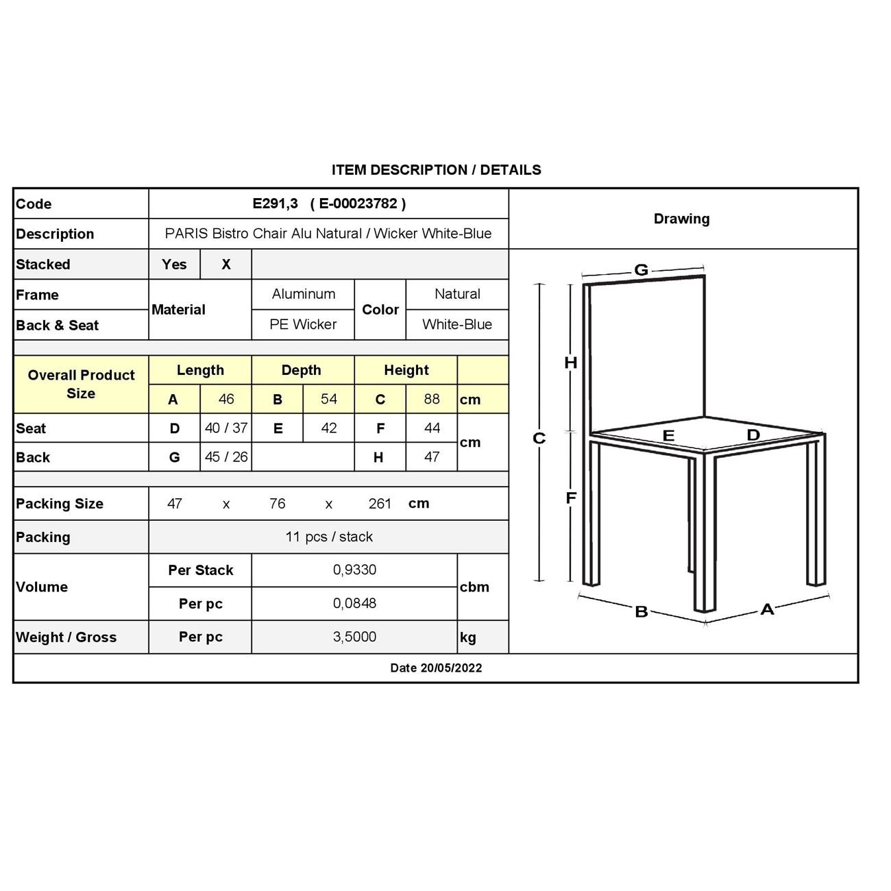 PARIS Καρέκλα Bistro Αλουμίνιο Φυσικό, Wicker Άσπρο – Μπλε, Στοιβαζόμενη (Ε-00023782)