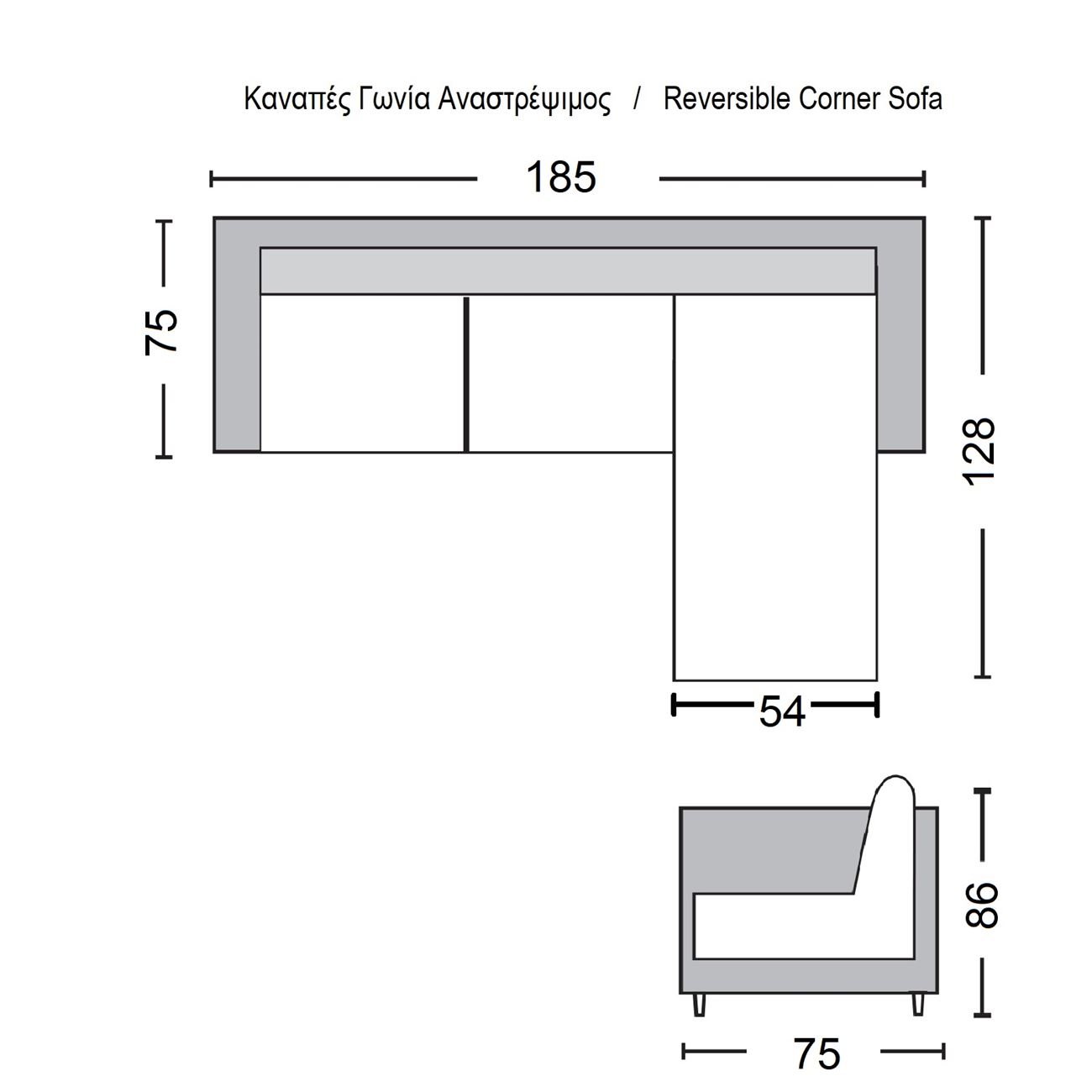 PORTO Καναπές Σαλονιού Καθιστικού, Αναστρέψιμη Γωνία Ύφασμα Σκούρο Γκρι 185x128x75cm H.86cm