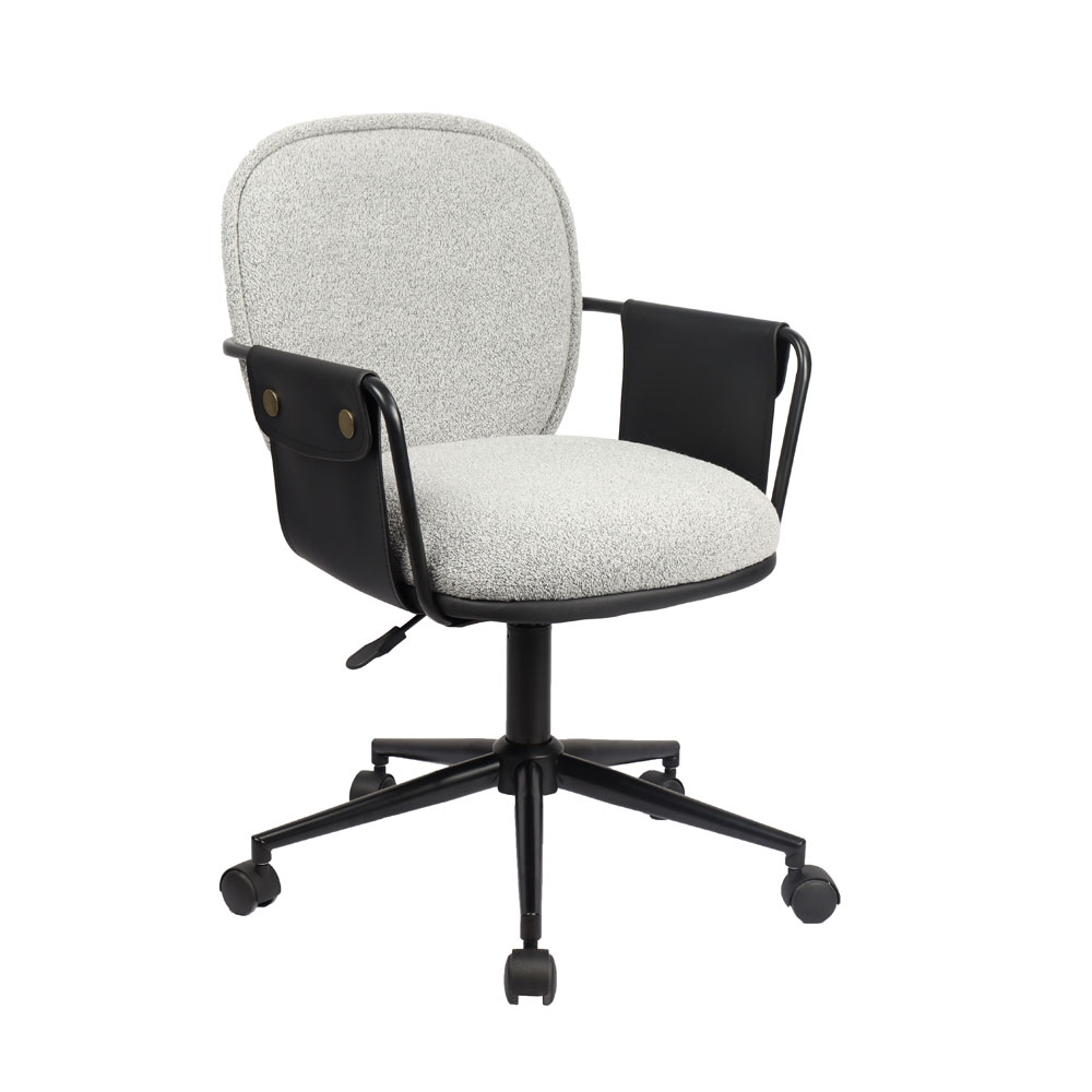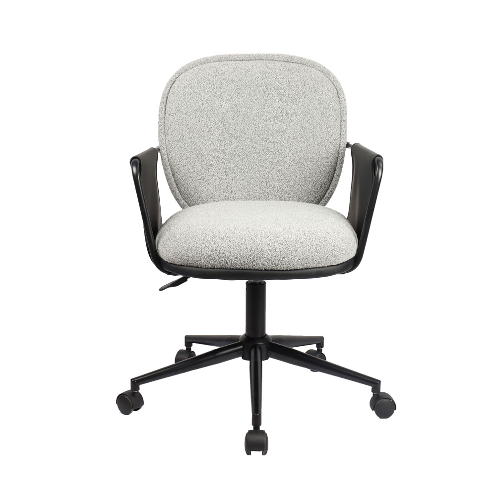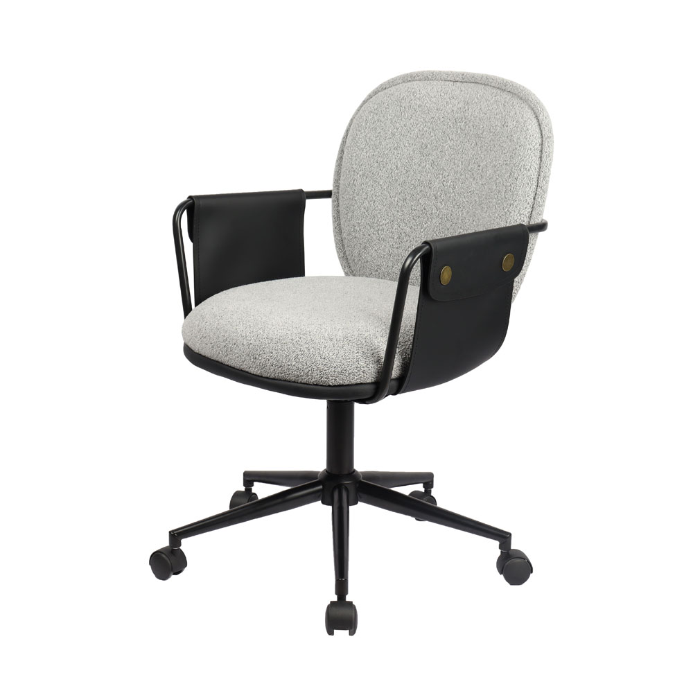 Η καρέκλα γραφείου Post συνδυάζει κομψότητα, άνεση και λειτουργικότητα, καθιστώντας την ιδανική επιλογή για έναν σύγχρονο χώρο εργασίας. Το κάθισμα και η πλάτη είναι επενδυμένα με μπουκλέ ύφασμα σε γκρι απόχρωση, χαρίζοντας μια ζεστή και φιλόξενη αίσθηση. Τα μπράτσα είναι επενδυμένα με μαύρη δερματίνη, προσδίδοντας μια διακριτική αίσθηση πολυτέλειας και μοντέρνας αισθητικής.Η μεταλλική βάση σε μαύρη απόχρωση εξασφαλίζει σταθερότητα και αντοχή, ενώ το σύνολο αναδεικνύει μια διαχρονική αλλά και μοντέρνα αισθητική.Η Post αποτελεί την τέλεια επιλογή για όσους αναζητούν μια καρέκλα γραφείου που συνδυάζει στυλ και πρακτικότητα.