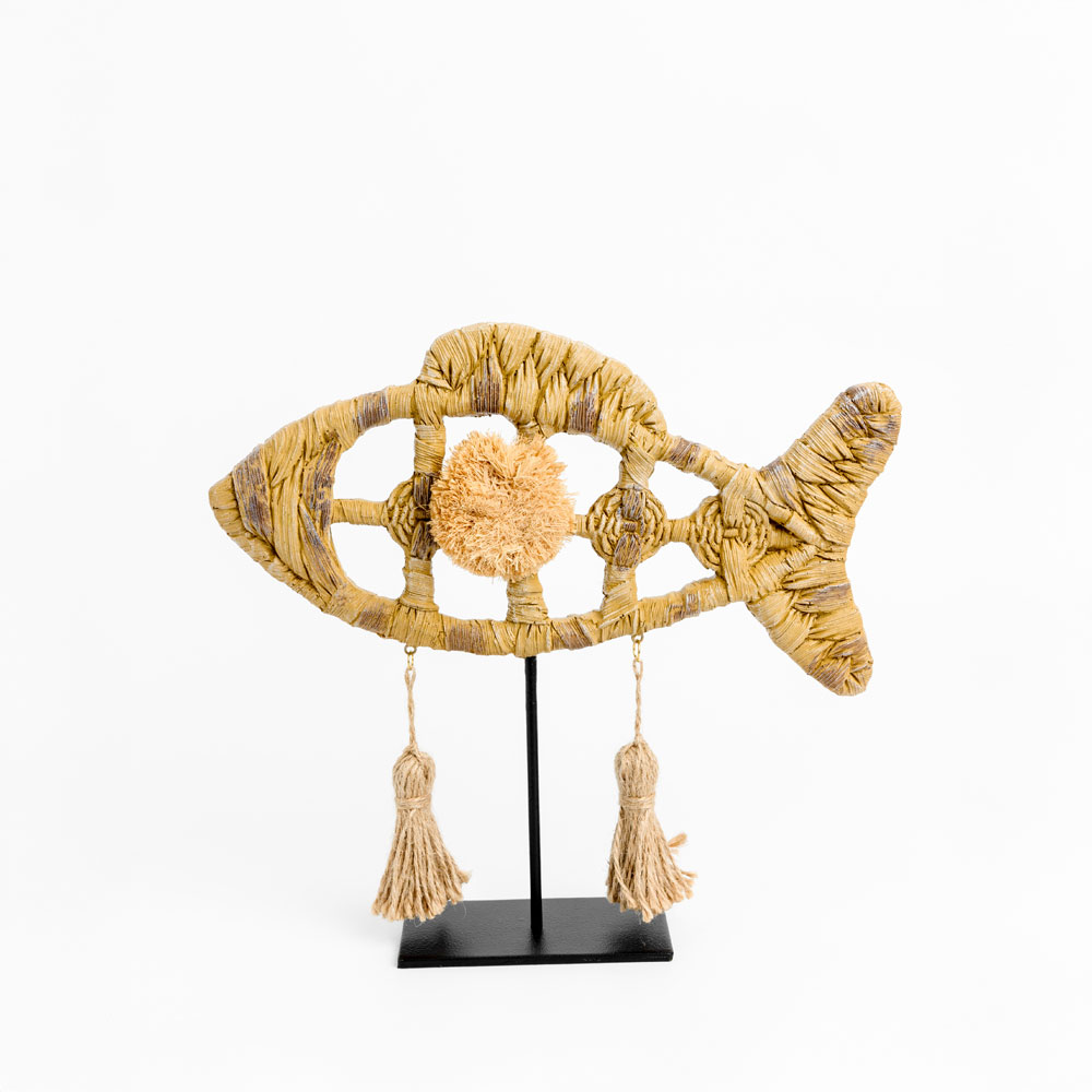Διακοσμητικό QUERSUS 2 σε σχήμα ψαριού από φυσικής όψης polyresin με μεταλλική βάση. Χειροποίητη αισθητική με σχοινένιες λεπτομέρειες και boho χαρακτήρα που προσθέτει ανεπιτήδευτη ζεστασιά σε παραθαλάσσιους, rustic ή ethnic χώρους. Ιδανικό για τοποθέτηση σε κονσόλες, ράφια ή καλοκαιρινές βιτρίνες.