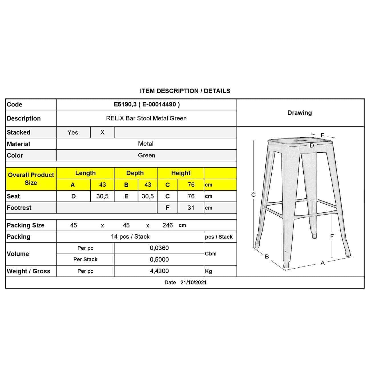 Ε5190,3 RELIX Σκαμπό Bar-Pro Μεταλ.Πράσινο