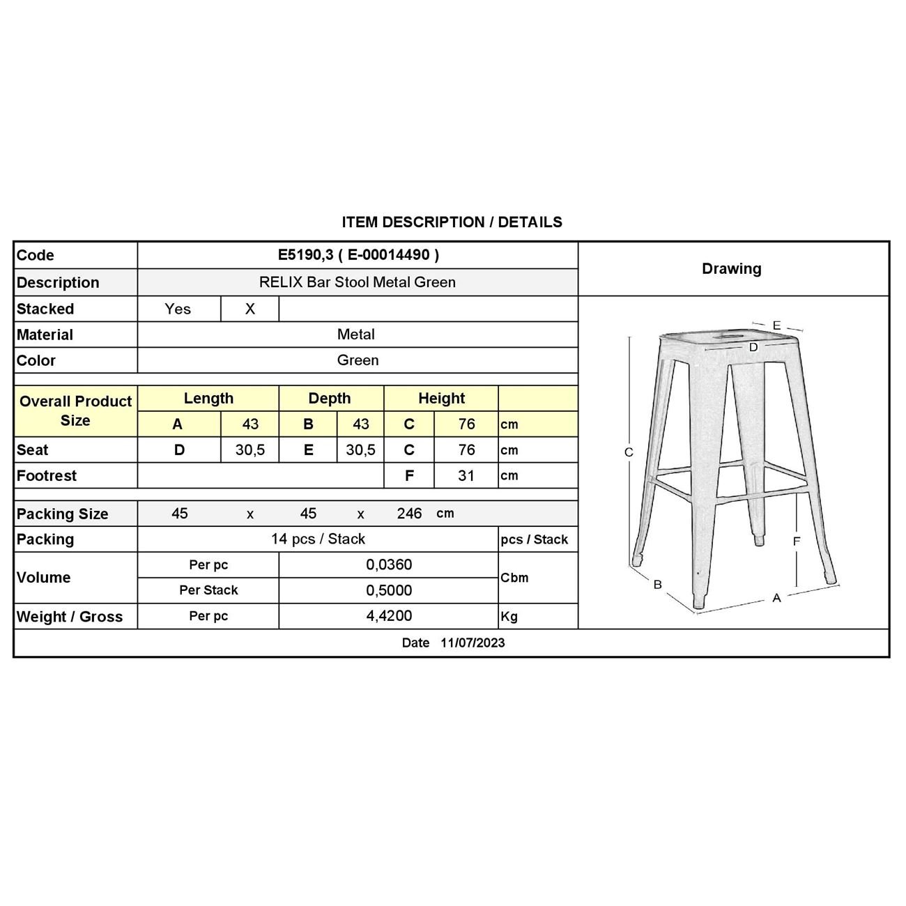 RELIX Σκαμπό Bar-Pro, Στοιβαζόμενο, Μέταλλο Βαφή Πράσινο 43×43 H.76cm