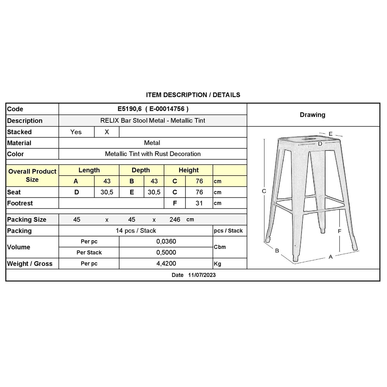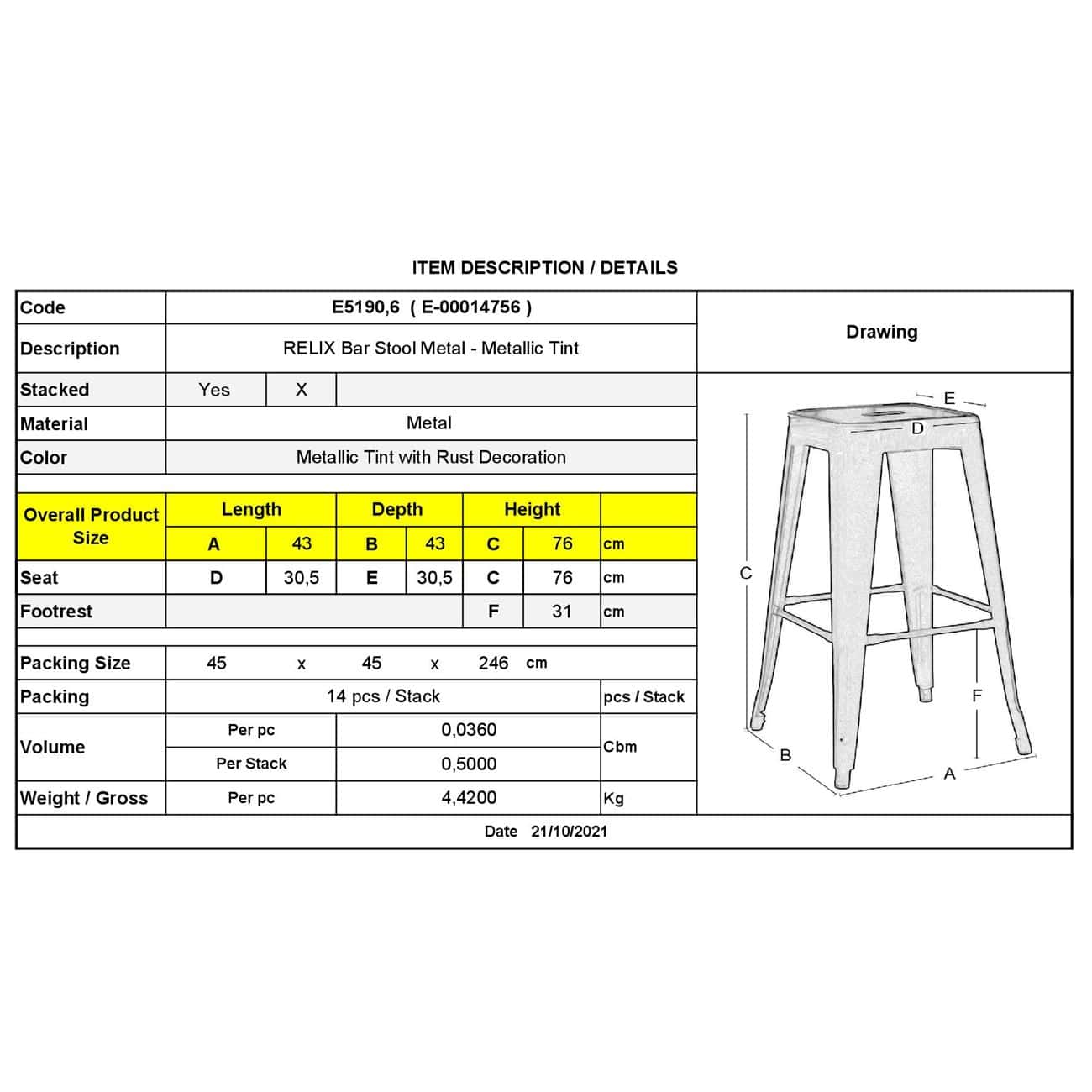 RELIX Σκαμπό Bar-Pro, Στοιβαζόμενο, Μέταλλο Βαφή Metal με Διακοσμητική Σκουριά (Ε-00014756)