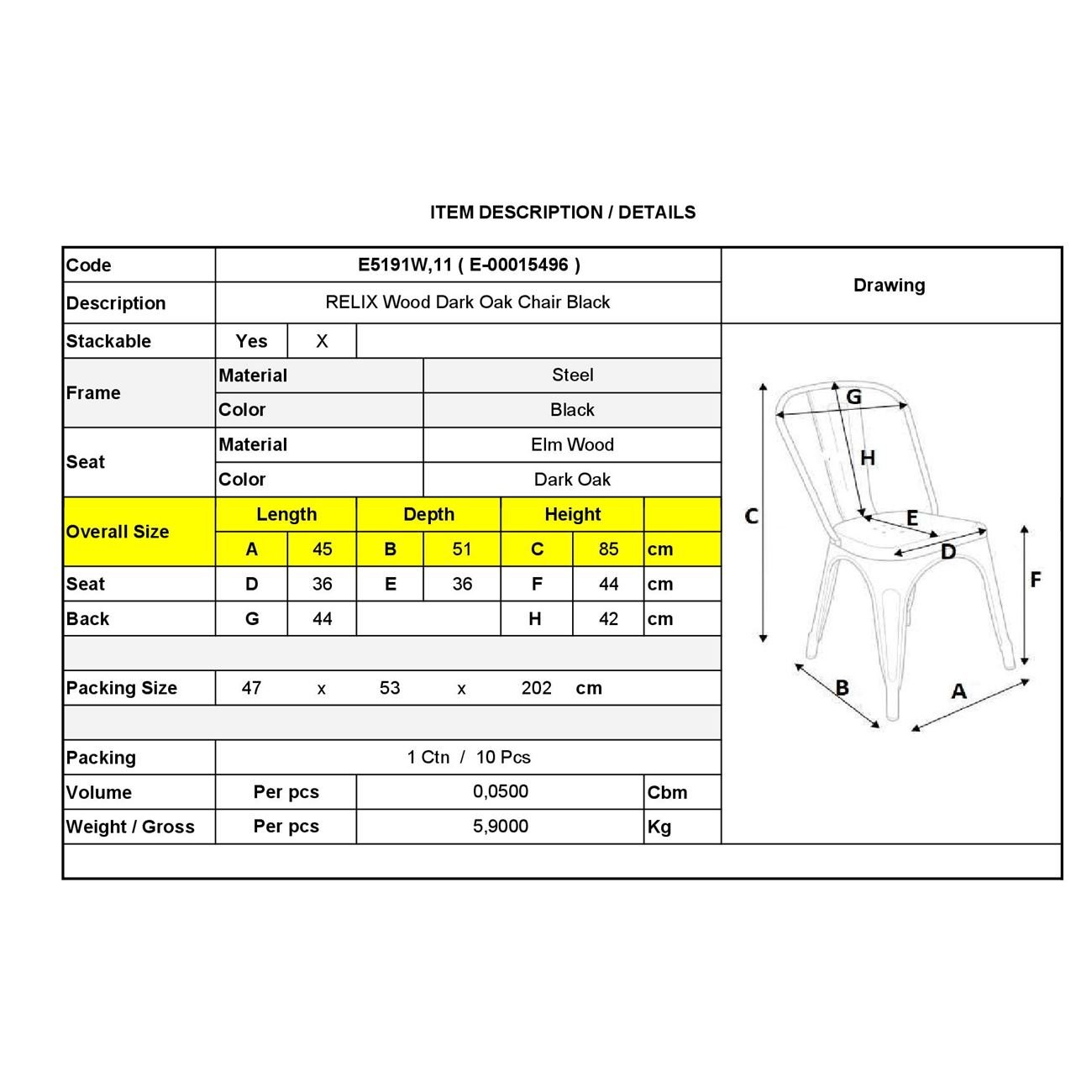 RELIX Wood Καρέκλα-Pro, Στοιβαζόμενη, Μέταλλο Βαφή Μαύρο, Κάθισμα Dark Oak 45x51x85cm