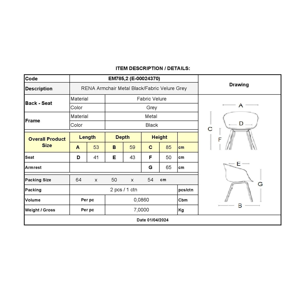 ΕΜ785,2 RENA Πολυθρόνα Μεταλ.Μαύρο/Ύφασμα Velure Γκρι