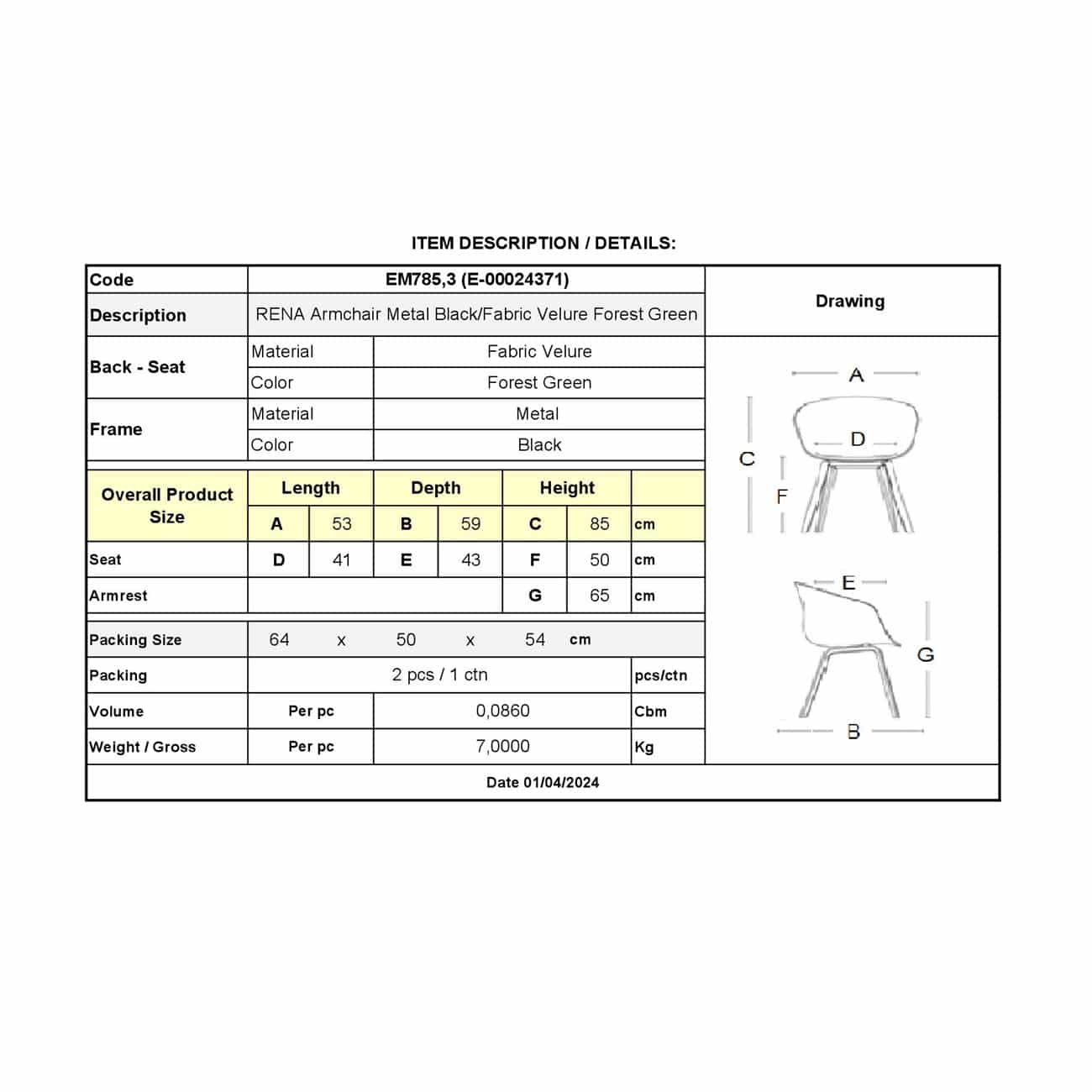 ΕΜ785,3 RENA Πολυθρόνα Μεταλ.Μαύρο/Ύφασμα Velure Forest Green