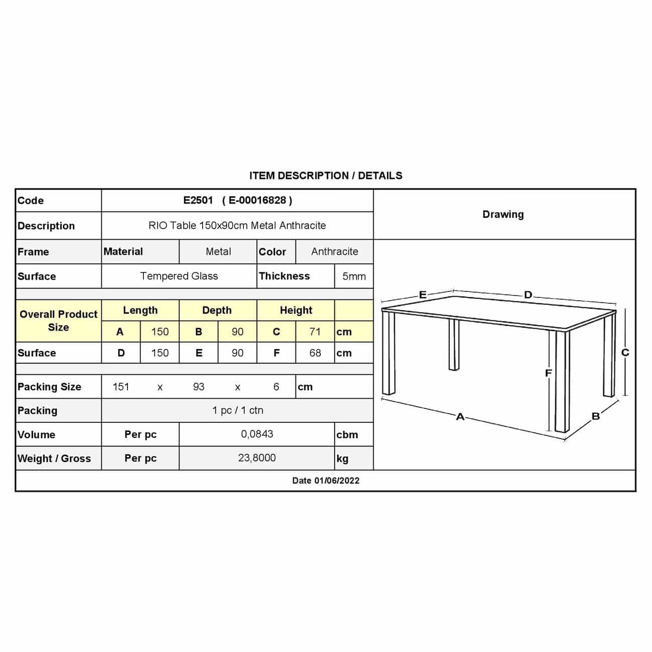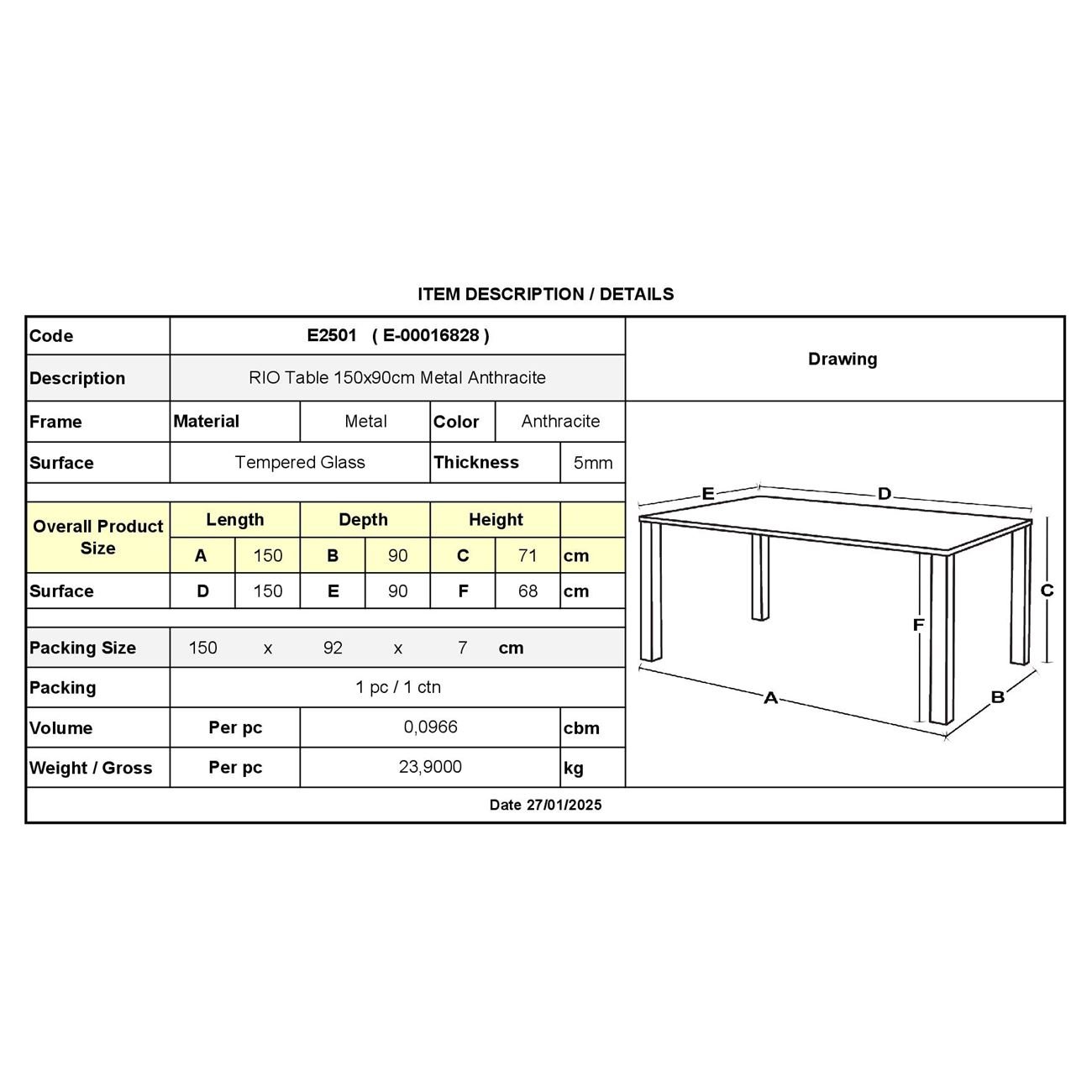 Ε2501 – RIO Τραπέζι 150x90cm Μεταλλικό Ανθρακί/Γυαλί