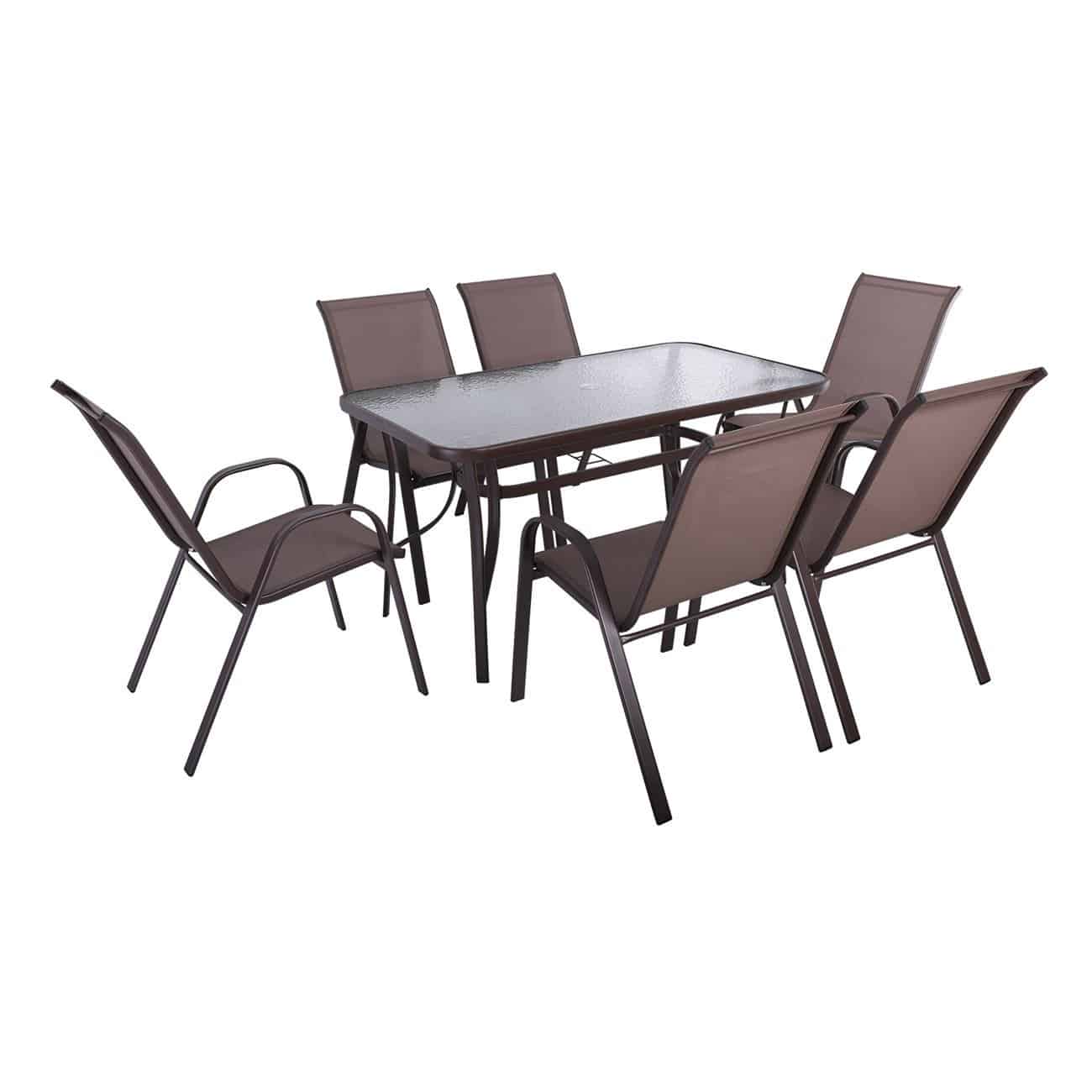 RIO Set Τραπεζαρία Κήπου Μέταλλο Καφέ, Textilene Καφέ: Τραπέζι + 6 Πολυθρόνες  (Ε-00025275)