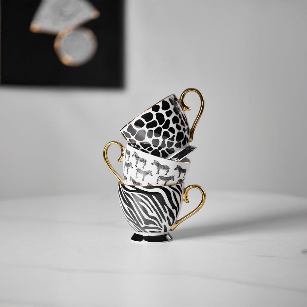 Η κούπα SAFARI παρουσιάζει ένα εντυπωσιακό μοτίβο σε λευκή πορσελάνη New Bone China, συνδυασμένο με μαύρες λεπτομέρειες και χρυσό τελείωμα. Ο σχεδιασμός της εμπνέεται από γραμμές και μοτίβα της άγριας φύσης, προσφέροντας ένα τολμηρό αλλά εκλεπτυσμένο αισθητικό αποτέλεσμα. Η πορσελάνη χαρίζει άνεση και αντοχή, ενώ το μοτίβο της προσθέτει ξεχωριστό χαρακτήρα στο τραπέζι. Ιδανική για όσους αγαπούν το μοντέρνο design με artistic πινελιές.