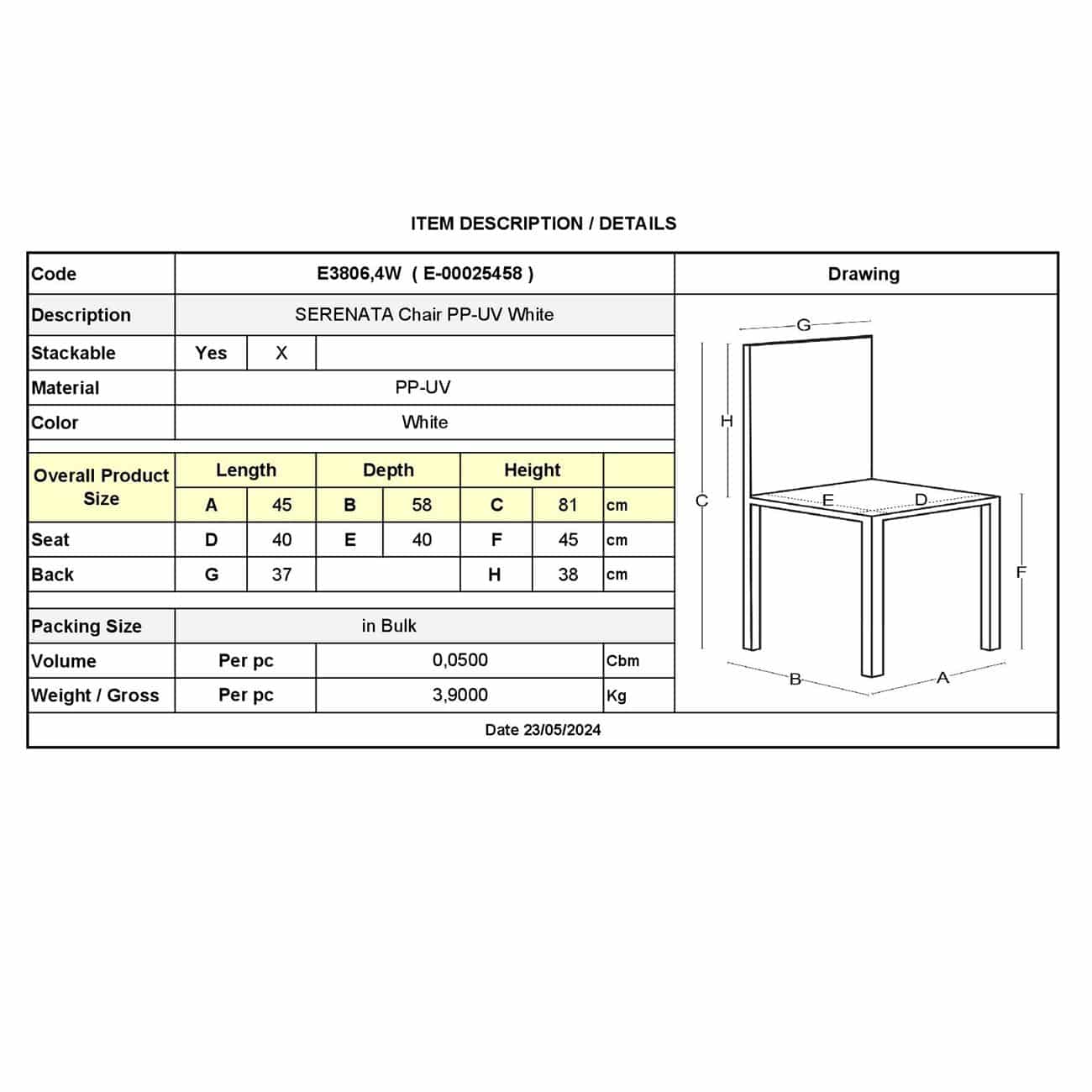 Ε3806,4W SERENATA Καρέκλα PP-UV Άσπρο , Στοιβαζόμενη