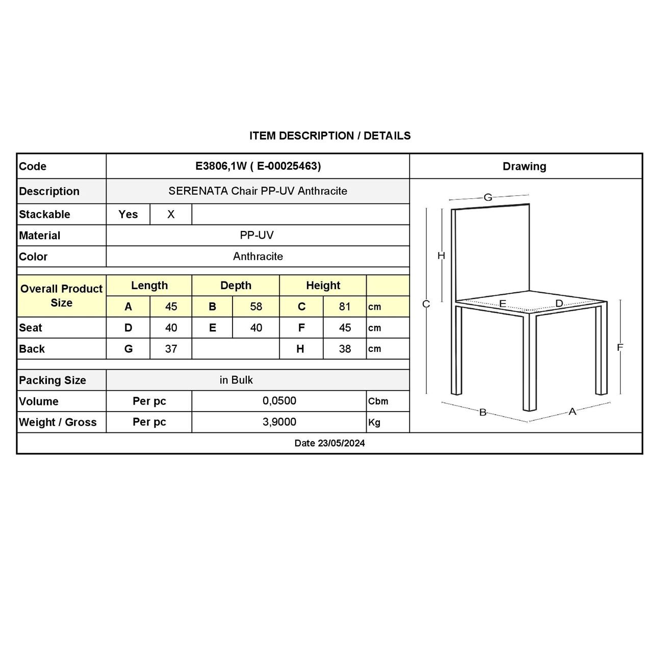 SERENATA Καρέκλα, Στοιβαζόμενη PP – UV Ανθρακί 45x58x81cm