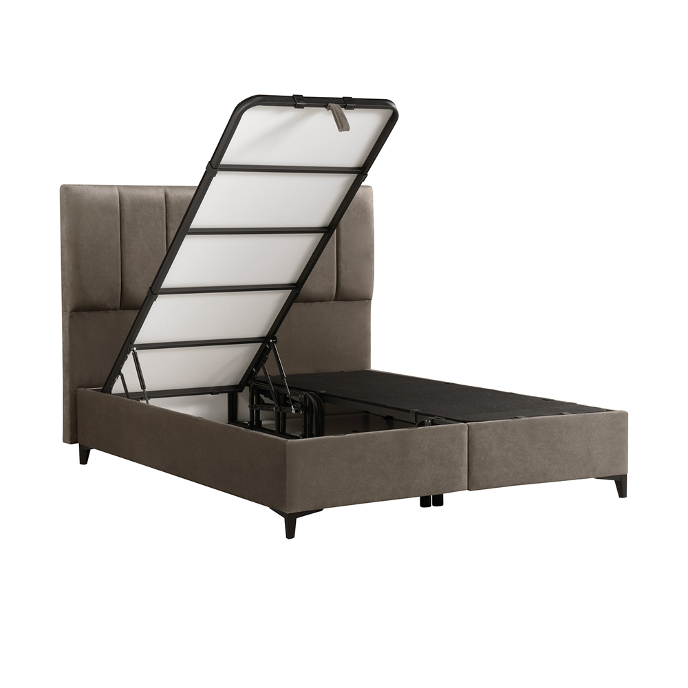 Κρεβάτι με αποθηκευτικό χώρο! Διαθέτει αεριζόμενο, αντιμικροβιακό, ευρύχωρο αποθηκευτικό χώρο και 4 αμορτισέρ ασφαλείας διπλής ενέργειας, που ανασηκώνουν εύκολα το στρώμα. Ειδική σχεδίαση και κατασκευή του κρεβατιού για απόλυτη απουσία τριγμών. Μεταλλικός σκελετός ηλεκτροστατικής βαφής, εξαιρετικής αντοχής, αντικραδασμικός. Πλαϊνά από οικολογική μελαμίνη, επενδυμένα με αφρώδες υλικό & ύφασμα . Απόλυτα επίπεδη και ενιαία επιφάνεια, ιδανική για κάθε τύπο στρώματος .Η επιφάνεια του υποστρώματος είναι καλυμμένη με αντιολισθητικό ύφασμα για την καλύτερη συγκράτηση του στρώματος. Ο πάτος είναι από μελαμίνη πάχους 8mm και φέρει αεραγωγούς. Ψηλά ποδαράκια για εύκολο καθάρισμα.