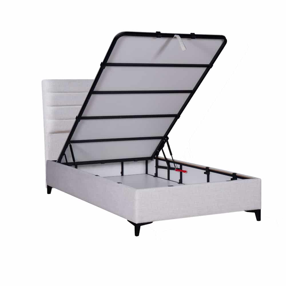 Κρεβάτι με αποθηκευτικό χώρο! Διαθέτει αεριζόμενο, αντιμικροβιακό, ευρύχωρο αποθηκευτικό χώρο και 4 αμορτισέρ ασφαλείας διπλής ενέργειας, που ανασηκώνουν εύκολα το στρώμα. Ειδική σχεδίαση και κατασκευή του κρεβατιού για απόλυτη απουσία τριγμών. Μεταλλικός σκελετός ηλεκτροστατικής βαφής, εξαιρετικής αντοχής, αντικραδασμικός. Πλαϊνά από οικολογική μελαμίνη, επενδυμένα με αφρώδες υλικό & ύφασμα . Απόλυτα επίπεδη και ενιαία επιφάνεια, ιδανική για κάθε τύπο στρώματος .Η επιφάνεια του υποστρώματος είναι καλυμμένη με αντιολισθητικό ύφασμα για την καλύτερη συγκράτηση του στρώματος. Ο πάτος είναι από μελαμίνη πάχους 8mm και φέρει αεραγωγούς. Ψηλά ποδαράκια για εύκολο καθάρισμα.