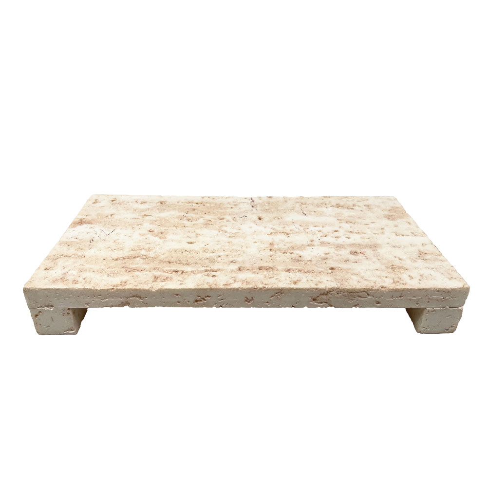 Ο δίσκος διακόσμησης TRAVERTINO σε διαστάσεις 34x17x4.5cm είναι κατασκευασμένος από polyresin με όψη πέτρας, αποδίδοντας τη φυσική υφή του travertine με σύγχρονο τρόπο. Η χαμηλή, καθαρή του γραμμή τον κάνει ιδανικό για coffee tables, κονσόλες ή τραπεζαρίες, λειτουργώντας ως βάση για κεριά, αρωματικά ή μικρά διακοσμητικά. Μπορεί να σταθεί και μόνος του, δίνοντας μια πιο γήινη και ισορροπημένη αίσθηση στον χώρο.