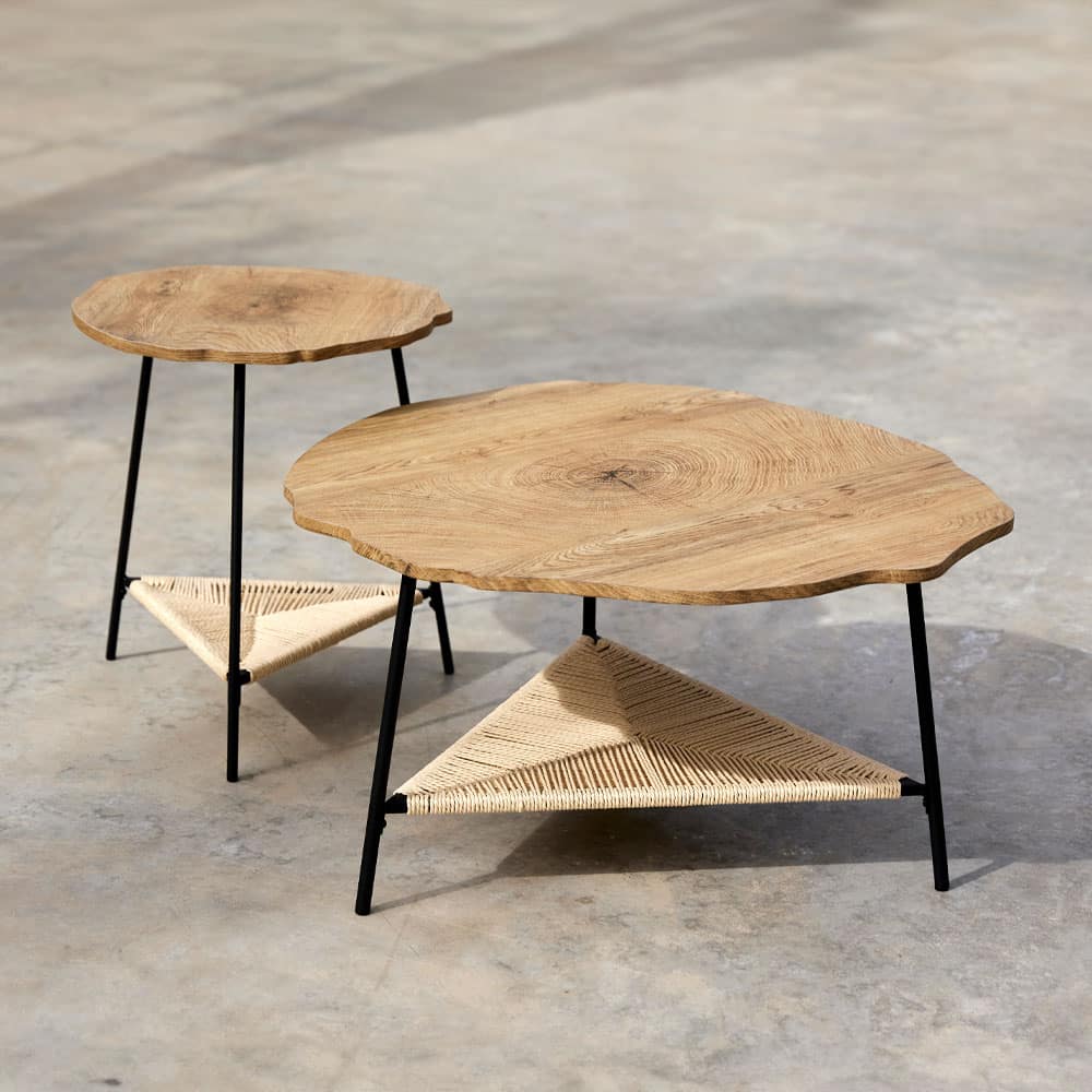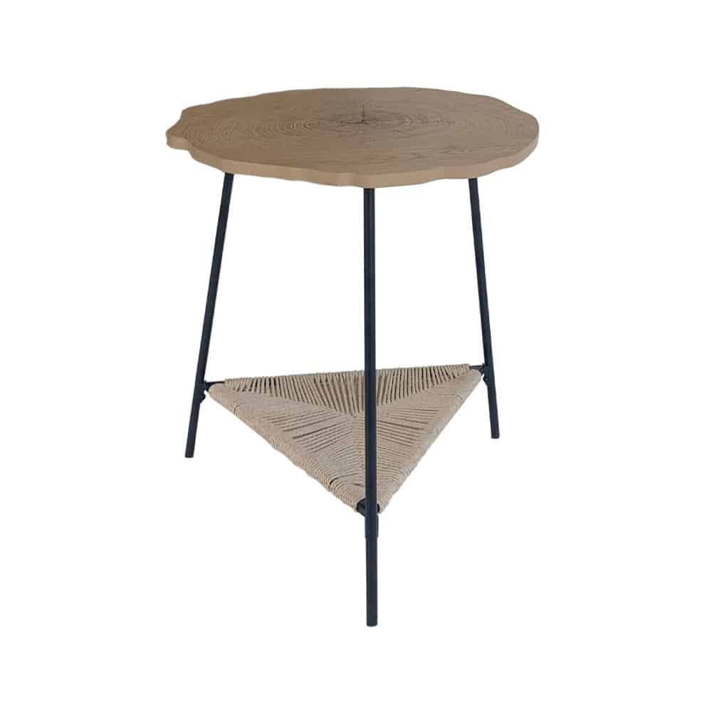 Το βοηθητικό τραπεζάκι σαλονιού Tree συνδυάζει την ομορφιά της φύσης με μοντέρνα στοιχεία, δημιουργώντας ένα μοναδικό κομμάτι για τον χώρο σας. Η επιφάνειά του, σε φυσικό χρώμα που θυμίζει κορμό δέντρου, φέρνει ζεστασιά και γοητεία στο σαλόνι σας. Κατασκευασμένο από μοριοσανίδα με επένδυση μελαμίνης carta, το τραπεζάκι προσφέρει ανθεκτικότητα και υψηλή ποιότητα. Τα μαύρα μεταλλικά πόδια προσδίδουν μοντέρνα αισθητική, ενώ το κάτω τρίγωνο ράφι από paper rope προσθέτει πρακτικότητα και ιδιαίτερη υφή, δημιουργώντας μια φυσική αίσθηση με έναν κομψό τρόπο. Το Tree είναι ιδανικό για όσους θέλουν να συνδυάσουν λειτουργικότητα και φυσική κομψότητα στη διακόσμησή τους. Αποτελεί επίσης μια ωραία εναλλακτική πρόταση για κομοδίνο, δημιουργώντας μια χαλαρή, μποέμ εμφάνιση στην κρεβατοκάμαρα.