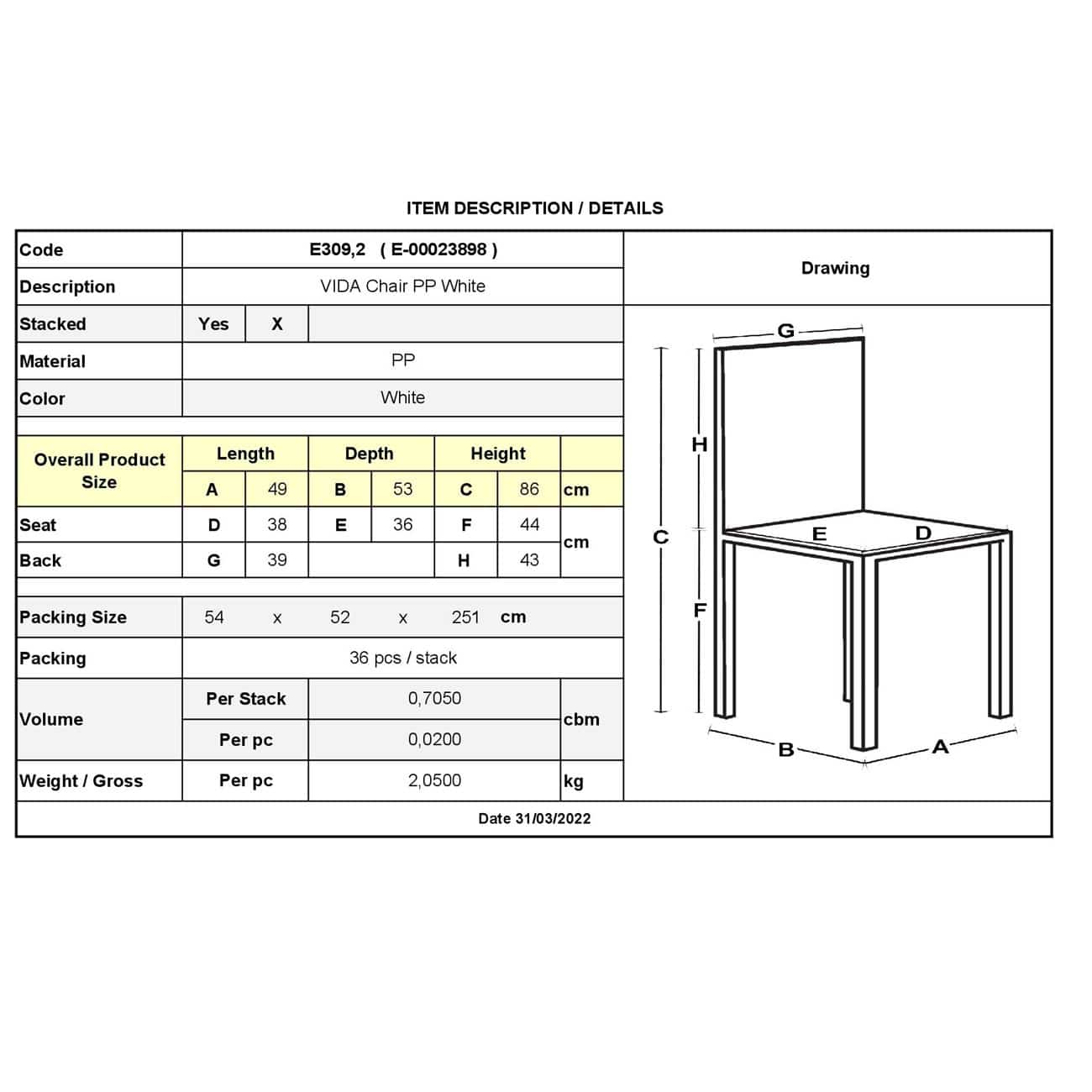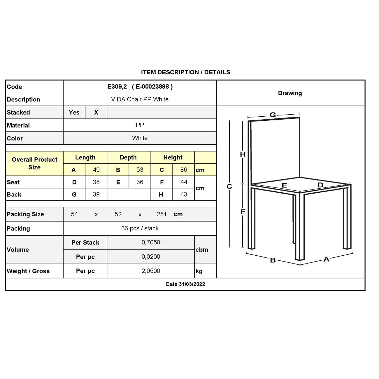 Ε309,2 VIDA Καρέκλα PP Άσπρο