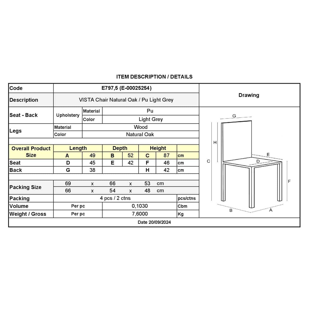 VISTA Καρέκλα Τραπεζαρίας- Κουζίνας, Απόχρωση Natural Oak Pu Ανοιχτό Γκρι (Ε-00025254)