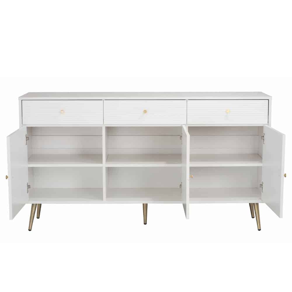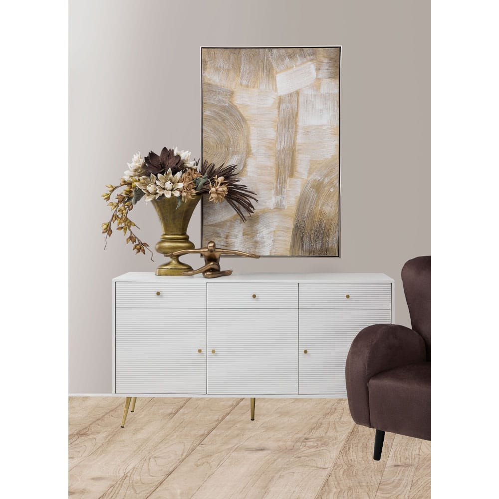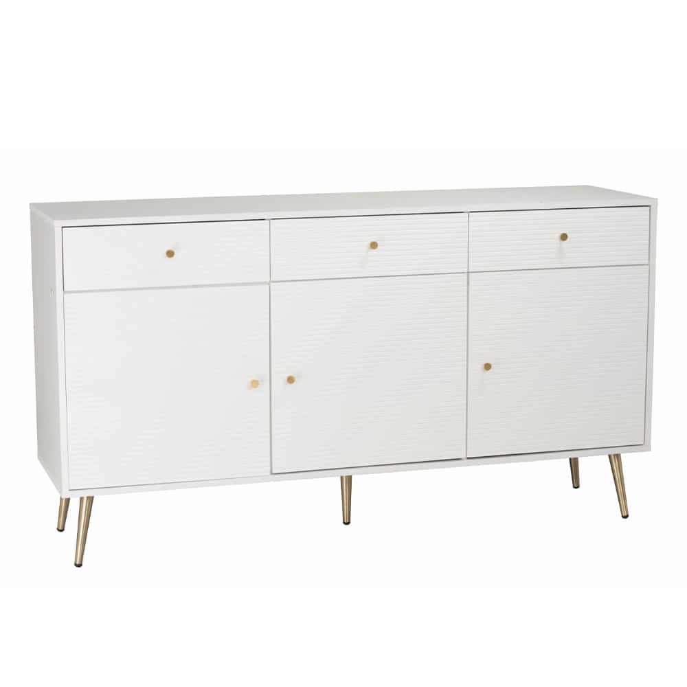 Ο μπουφές Zizel αποτελεί την επιτομή της διακριτικής κομψότητας και της μοντέρνας αισθητικής. Με επένδυση από paper wood και λακαριστό MDF σε λευκή απόχρωση, αναδεικνύει μια αίσθηση καθαρότητας και φρεσκάδας, ενώ το ανάγλυφο ριγέ σχέδιο προσθέτει μια διακριτική υφή που μαγνητίζει τα βλέμματα. Τα χρυσά μεταλλικά πόδια προσδίδουν έναν αέρα πολυτέλειας, ενισχύοντας τη φινέτσα του σχεδιασμού. Ο μπουφές Zizel είναι η ιδανική επιλογή για να εμπλουτίσετε τη διακόσμηση του χώρου σας, συνδυάζοντας πρακτικότητα και υψηλή αισθητική.